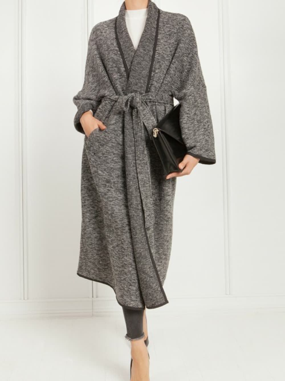 Last minute invite to an art gallery opening. You’ll look every bit sexy and styled draped in this full length robe inspired duster. The rich charcoal grey tone add depth and dimension, while the wrap around belt of this ribbed coat ties it all together. 30% Wool, 70% Polyester Machine Wash/ Mild Dry Clean Do not Bleach Iron at 110 degrees max Notes: Mixed wool texture Thick but soft Model is 173 cm/5'8'' and is wearing size S/M