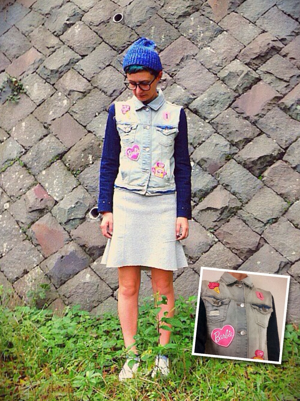 My version "denim on denim". I wore denim sleevles top on denim shirt. Sweat skirt, slipon sneakers and beanie.