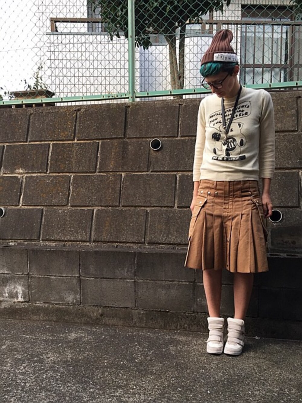 Beanie, knitwear, kilt and high cut sneakers. White and brown.