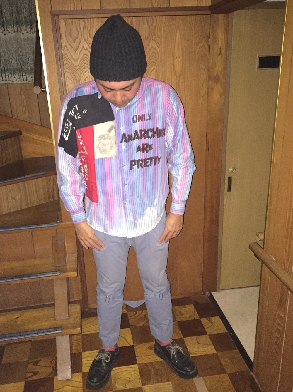 僕がストリートスタイルと同じぐらいすきなのがこのパンクスタイル! セディショナリーズのかなり昔に復刻されたアナーキーシャツに、流行りに乗って購入したフィンガリンのボンテージパンツ、さらに高校ん時にお金を貯めて貯めてやっとかったヘビ柄のラバーソールを合わせてガチガチのパンクスタイルに笑 ニットキャップでちょっとだけカジュアルダウン!