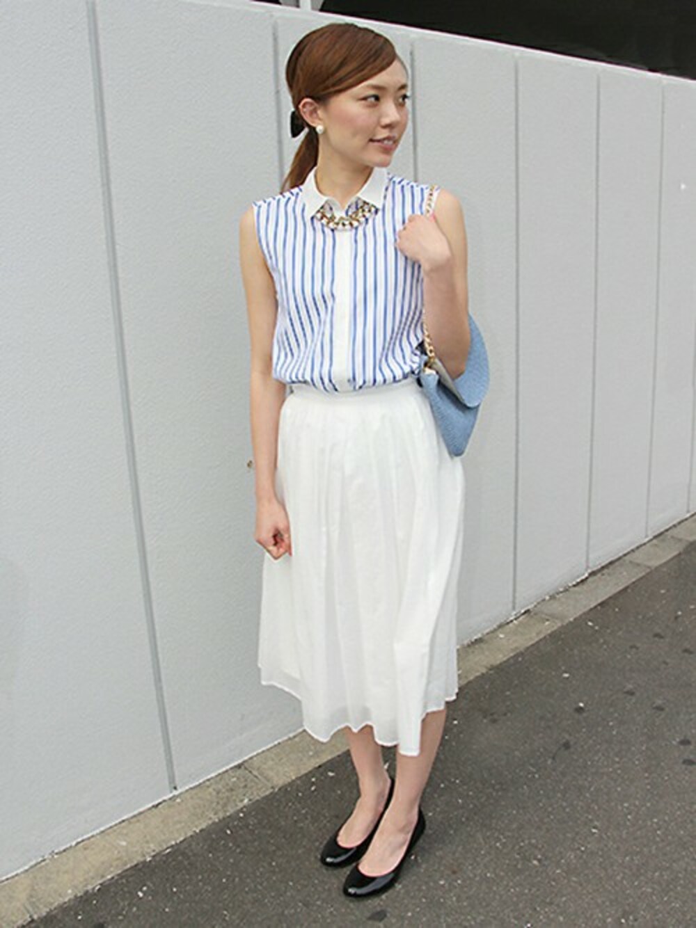 爽やかなノースリーブブラウスはよく見ると細かくストライプ状に透かし模様が入ったオシャレな生地を使用しています! 今回は爽やかなオフィススタイルをイメージして、ミモレ丈のスカートと組み合わせてみました。 定番のコーデですが今年らしくさりげないシアー感のあるアイテムを選ぶ事で、より軽さが際立つ様にしています。 白のスカートは着るのに少し勇気がいるアイテムだと思っていましたが、とにかく一枚プラスするだけで明るくなるのが嬉しい! ヘビロテの予感がします♪
