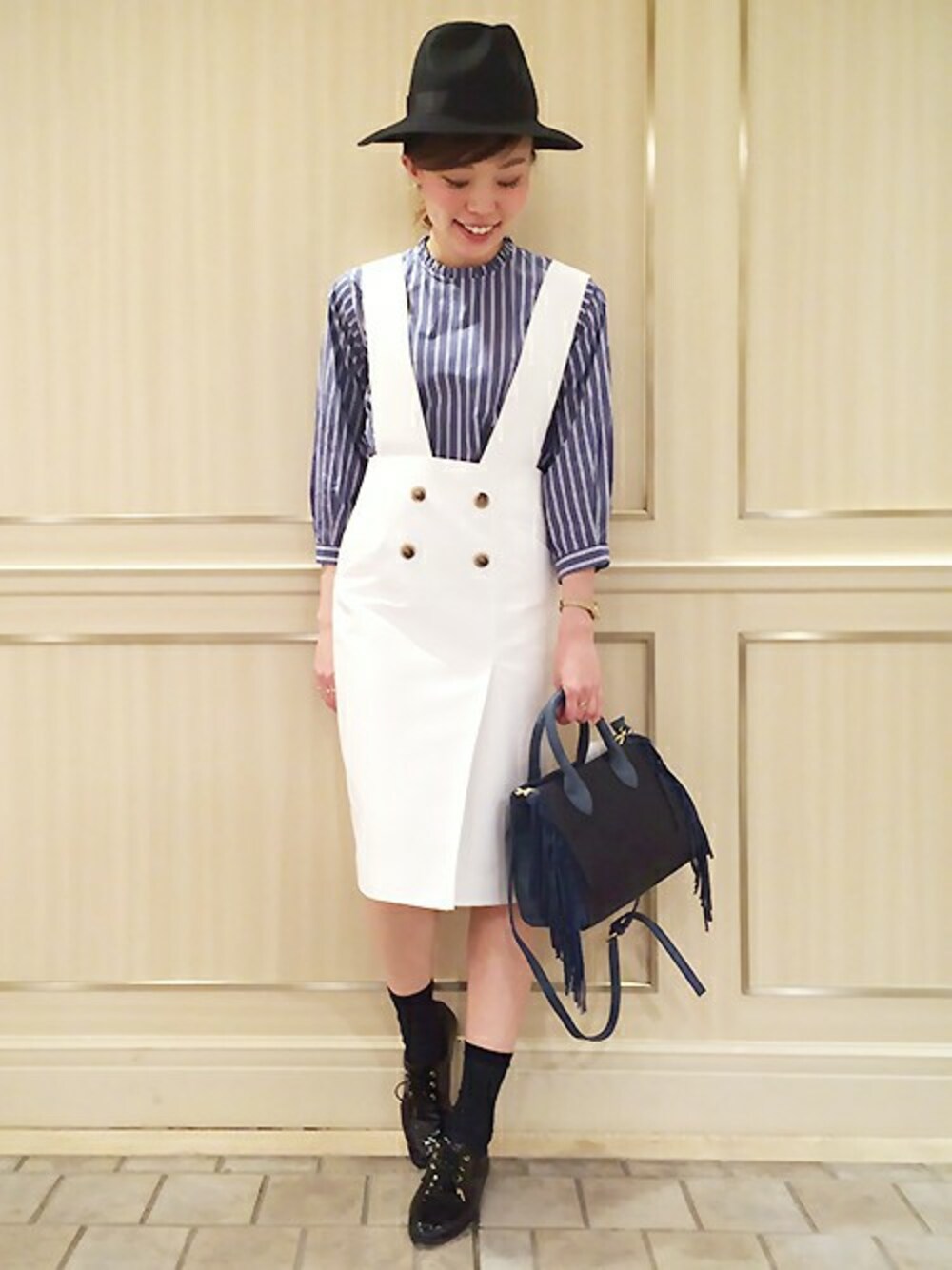 前回着たエプロンドレスの着回しスタイルをご紹介します♪ 今回はどこか懐かしい雰囲気のストライプブラウスを合わせて、よりエプロンドレス自体のデザインをハッキリ見せてみました。 コクーンシルエットがオトナな印象になりますよ☆ ハットやフリンジモチーフの付いたバッグでマニッシュな雰囲気をプラス、前回とがらりと雰囲気が変わりますね! インナー次第でまだまだ色々な表情を出せるエプロンドレス、二子玉川店のイチオシですよ!