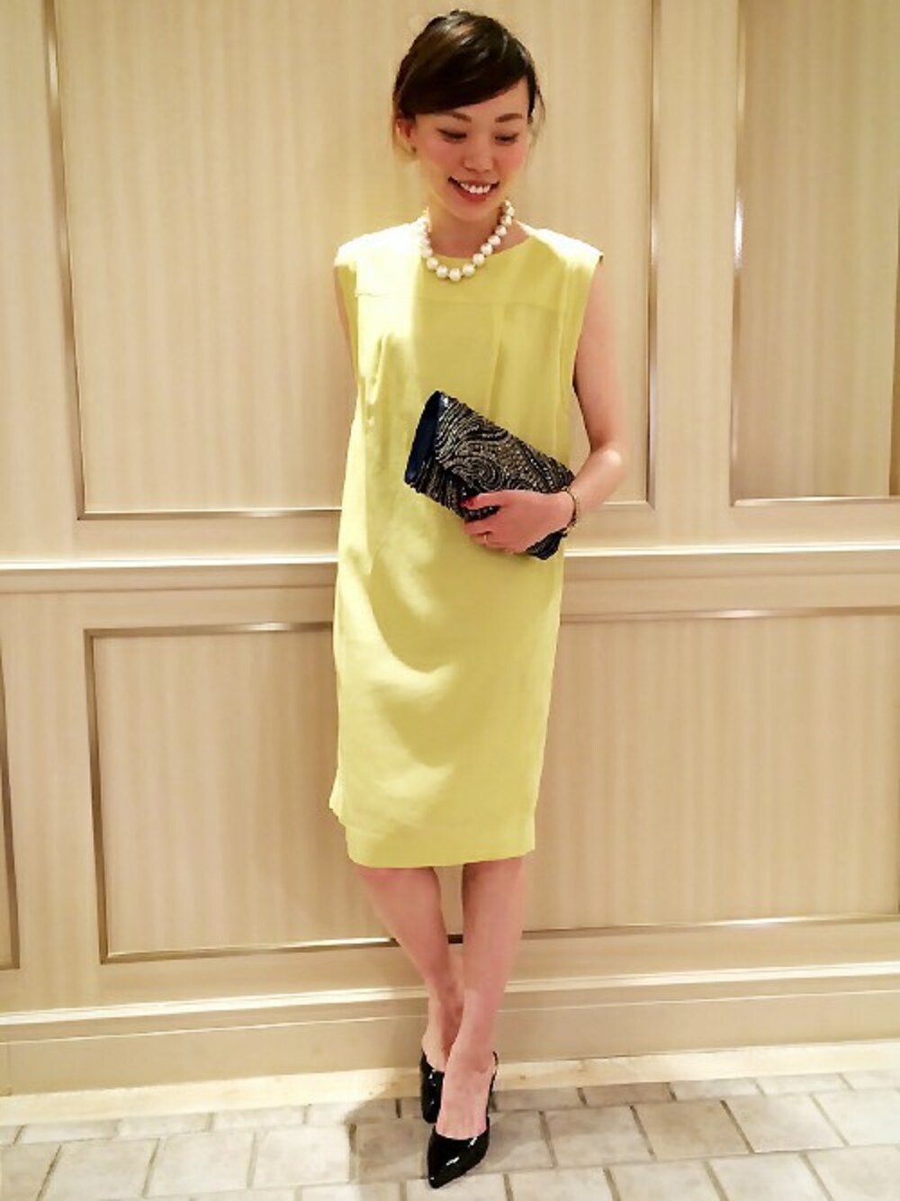先行予約でも大人気だったワンピース、ショップにも入荷しました! いつもは着ないイエローも落ち着いた色合いなのでチャレンジしやすいカラーです。 今回はパールネックレスやパーティバッグで華やかさをプラス、ちょっとしたお呼ばれにも映える コーデに仕上げました。