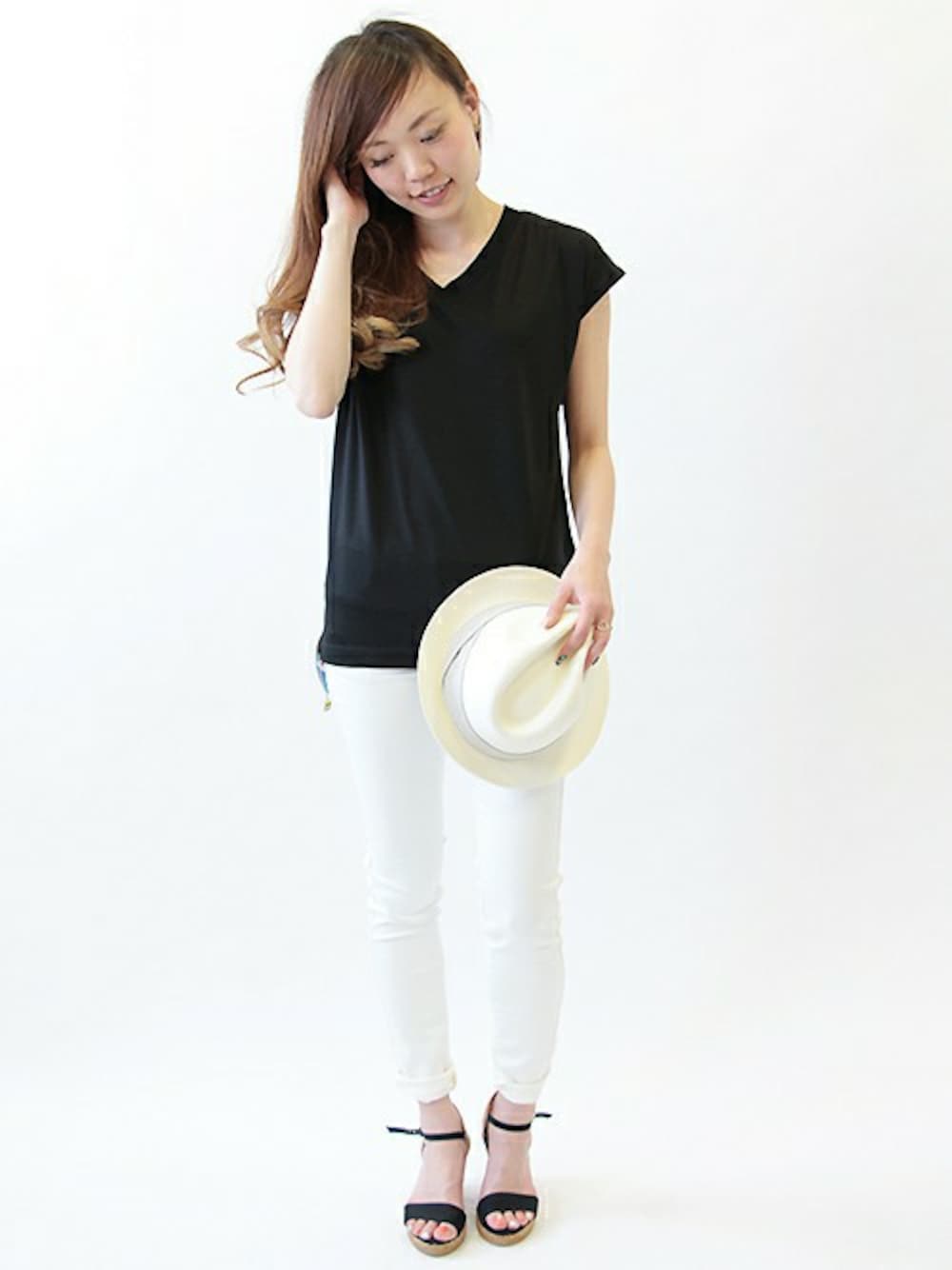 昨年も大人気だったカットソー、Vネックの襟元だけ素材を変えたデザインが今年も登場しています! 深開きじゃない、ちょっとだけデコルテが見える感じが絶妙です。 肌にさらっと馴染む着心地の良い生地もリピーターになる方が多い理由です☆ 夏のモノトーンはシンプルだけどカッコ良く見える組み合わせなので、おすすめですよ。
