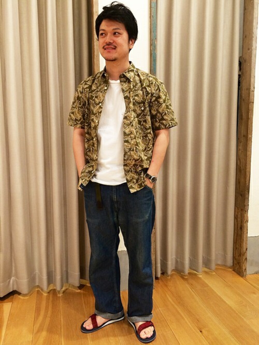 絶妙な配色が際立つリーフ柄プリントシャツを主役にしたこの時期にぴったりなコーデ。 トーンオントーンカラーのシャツはアロハシャツ程うるさくなり過ぎず大人カジュアルにぴったりですね。 程良い色落ちのデニムにはスポサンを合わせ軽さを出しています。