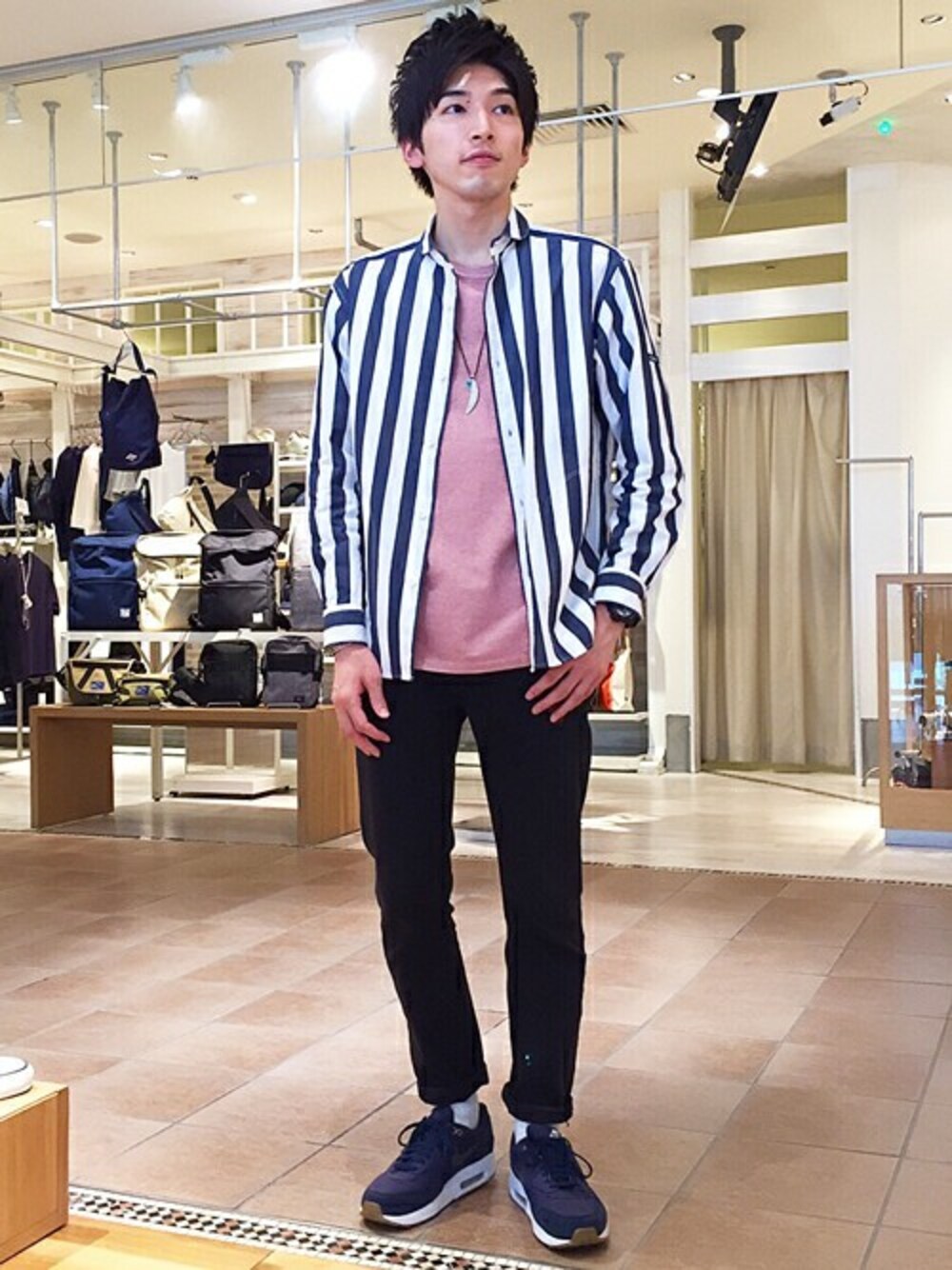 ネイビーとホワイトで初夏らしく爽やかにまとめたコーデ。 トレンドカラーのピンクはインナーに入れる事で程良いアクセントに。 シャツはフルオープンにすることでキレイ目になり過ぎない抜け感のあるスタイルの完成です。 続々春物が入荷中ですので是非お店にもいらしてくださいね!! ◆APC PETIT STANDARD(40693559902)