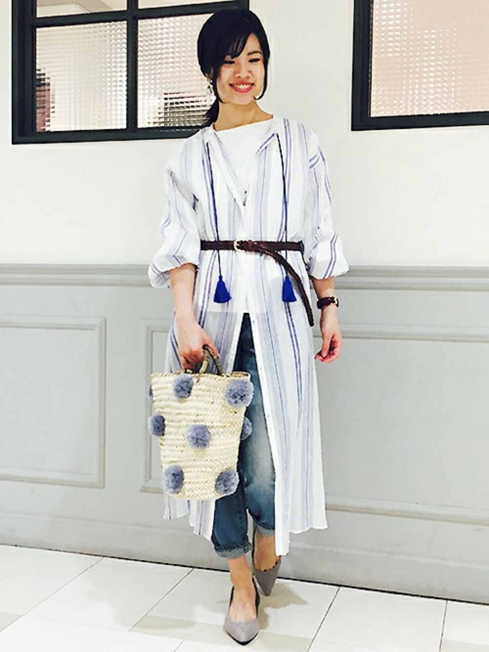 トレンドの長めの羽織アイテムはシンプルコーデに投入するだけでぐっとこなれ感が出せますよ! もちろんワンピース風にフロントを閉じて着るのもおすすめ。今の時期から長く使えるのも嬉しいですね。 ポンポン付のバスケットを合わせてソフトなエスニックテイストを添えました。 ◆パンプス(60512537101)