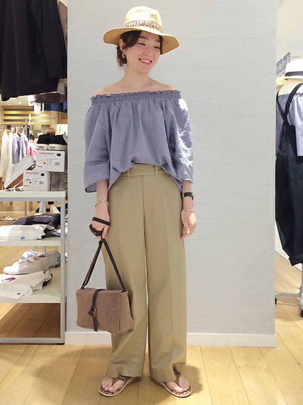 先行予約でも大人気だったギャザーブラウスがいよいよ入荷! 38サイズのワンサイズで、普段36を着る私で程よくゆったりと着られます。 トレンドの肩出しもこのブラウスならナチュラルな生地感で挑戦しやすいですよ☆ 小物をベージュ系でまとめてオトナっぽく仕上げたのがポイントです!