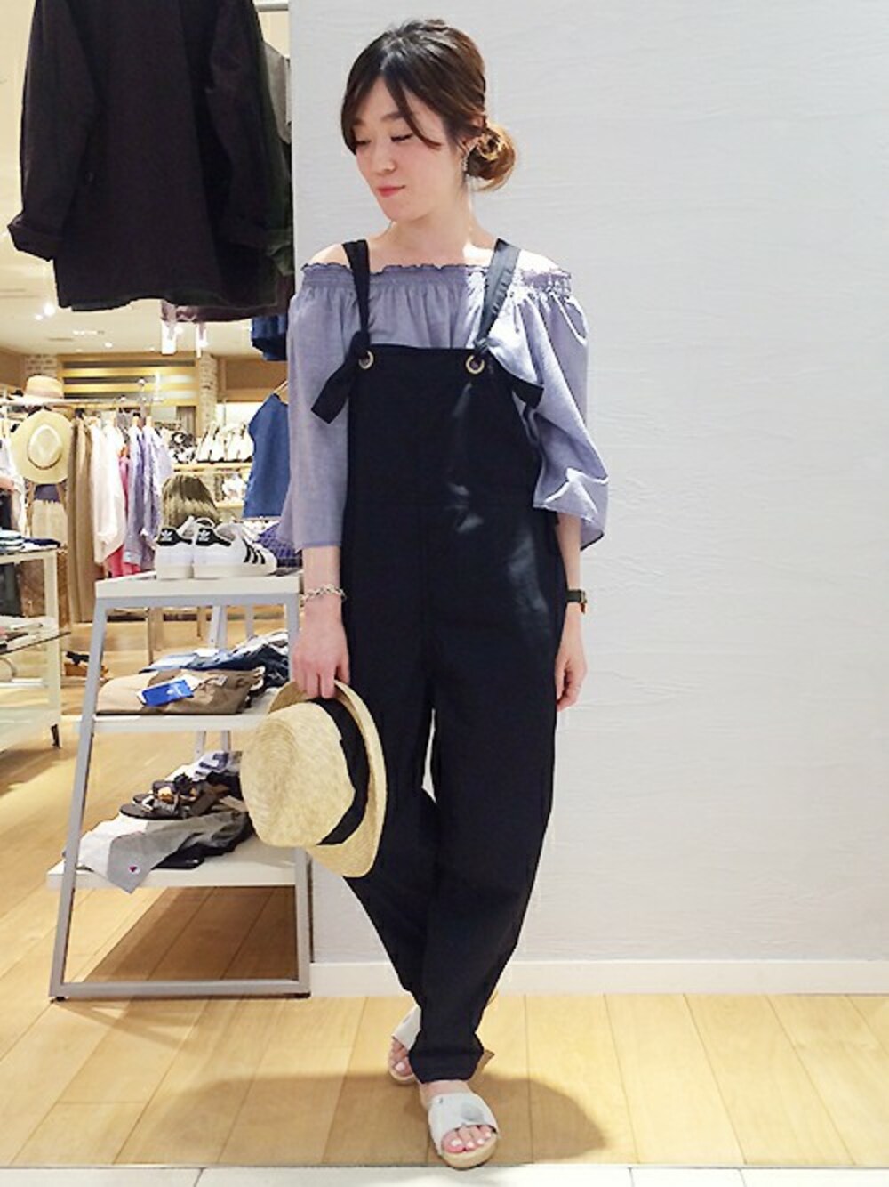 以前も登場したオフショルダーのブラウスの着回しコーデです! お店でも人気の、少しゆったりめのサロペットを合わせて大人っぽくコーディネートしました。 このサロペット、リボンを結んで長さを調節するデザインでとっても楽チン! サイドもリボン仕様でフィット感を調整出来るんですよ☆ 柔らかい生地で夏のリラックスコーデにはピッタリ。 フラットサンダルで今年らしいスタイルに仕上げました。 ■ハット(HP638205)ベージュ/FREE