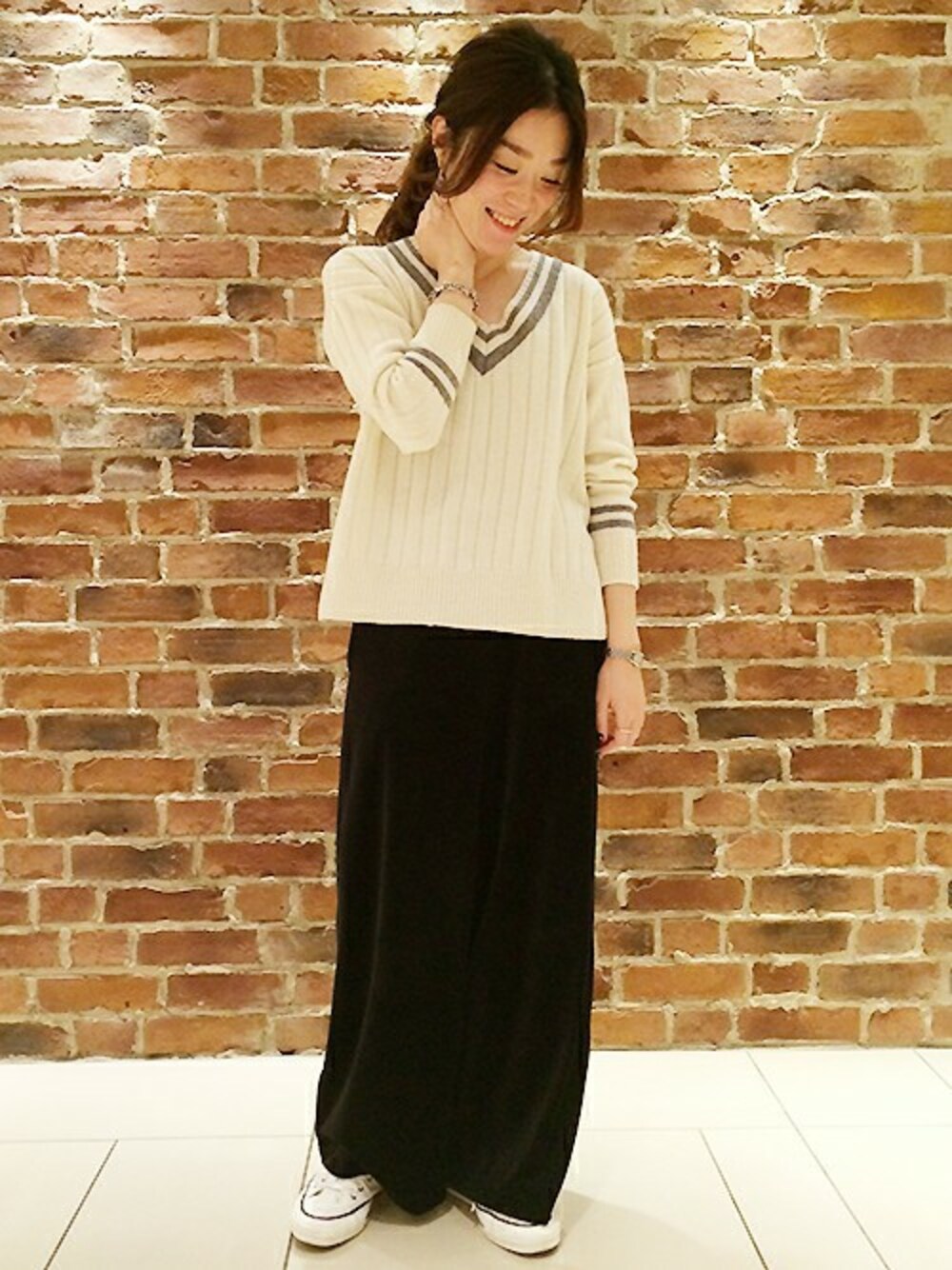 先行予約でも大人気だったチルデンニットは可愛らしい表情とデコルテをスッキリ見せてくれるオトナ顔の 両方を備えたおすすめアイテム。 敢えてシンプルにまとめてニットの存在感を際立たせました。 ゆるっとしつつも上品なベロアパンツはオトナのリラックススタイルにピッタリ。 気を張り過ぎないスニーカーでまとめるのが気分です。