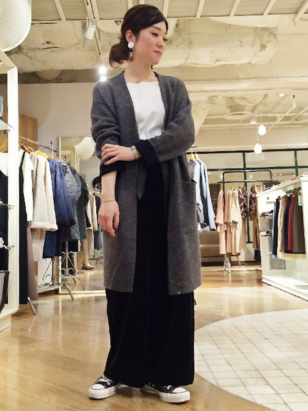 前回のワイドパンツを着回し!あえて38サイズでゆるっと履く事で生まれるルーズ感が可愛いです。 今回はトレンドのコーディガンとシンプルにまとめました。 本格的なアウターを着る間に羽織るもの、意外と迷いますよね。 FGのコーディガンはしっかりあたたかいだけでなく、内側をバイカラーにしてアクセントを付けています。 秋冬だからこそ着たくなるモノトーンコーデを目指しました。