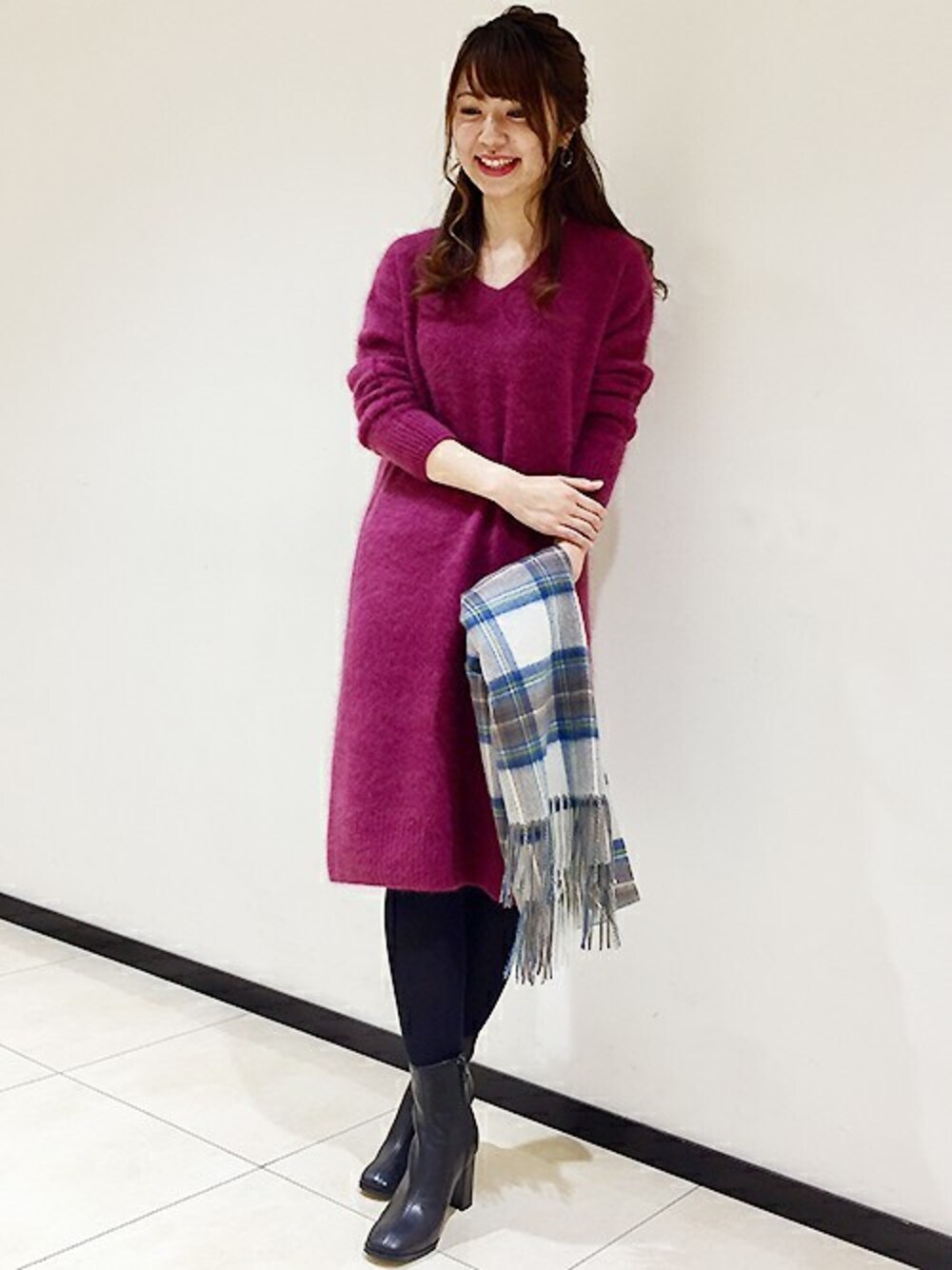 ふわふわのフェレットニットワンピースでシンプルな大人可愛いコーデにしました。 今シーズン気分のワインピンクの色に、カシミヤのチェックストールを合わせてカジュアルめに。 見た目の可愛さだけでなく、暖かさも抜群の冬にぴったりなコーディネートです♪