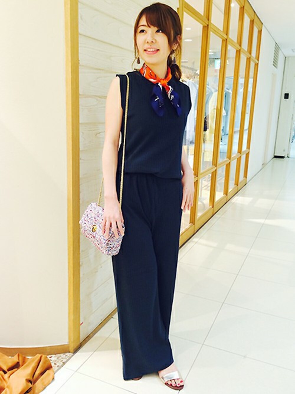 トレンドのセットアップの新作が届きました! 人気のリブ仕様ですが、ぴったりし過ぎず着心地もソフト。 パンツも同じ素材ですが、シルエットが出にくいのでぜひこの秋挑戦したいアイテムです! シンプルな組み合わせにクラシカルなツイードバッグとスカーフをチラリ。 さりげないアクセントでコーデがぐっと華やかになりますよ。