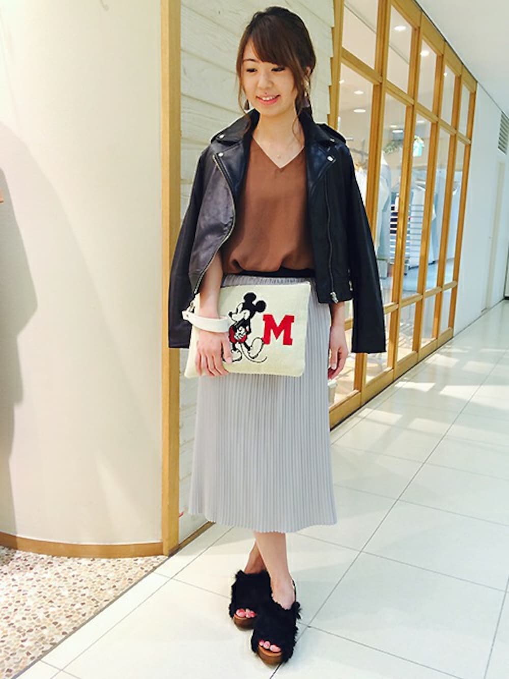 ちょっぴりきれいめなブラウスとスカートにあえてハードなライダースジャケットを合わせた 大人カジュアルコーデ。 ハードなイメージのライダースもコンパクトなサイズのものをチョイスすれば一気に こなれた印象に。 シーズンムードを盛り上げるファーのシューズもとってもキュート! 新しい季節のアイテムはまず小物から取り入れるのがおすすめですよ。 ◆ジャケット(60362524205)ブラック/36サイズ ◆クラッチバッグ(60507532102)オフホワイト/FREE ◆シューズ(60518537103)ブラック/37サイズ