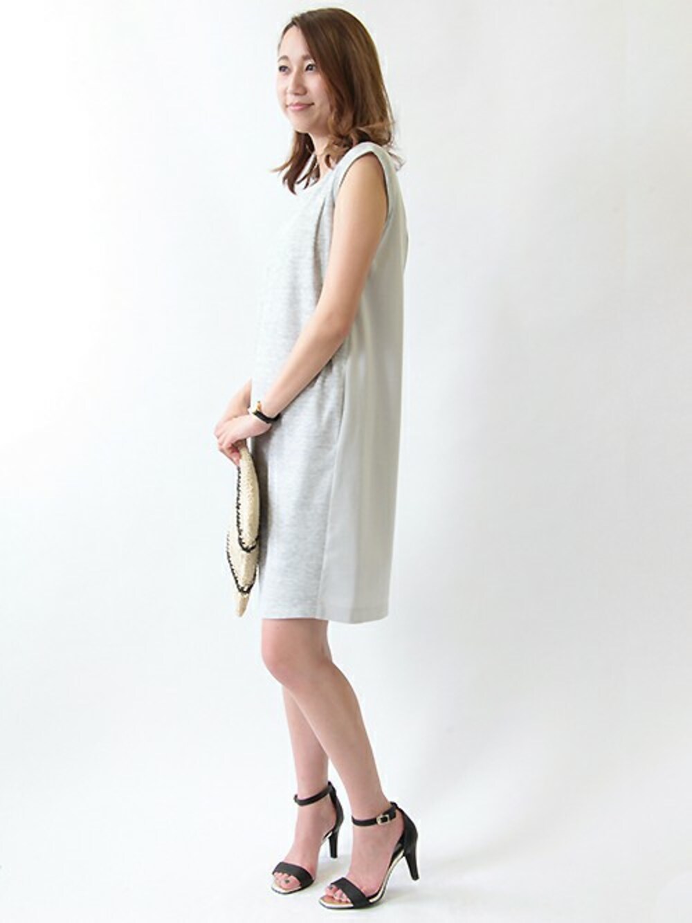 前後で違う素材をドッキングさせたワンピース、シルエットもキレイなのでおすすめです! 肩から縦に入ったタックが良いアクセントになっています。 あえて飾り過ぎずサンダルとバッグのブラックを効かせたコーデに仕上げました。 シンプルですがさりげないギミックの詰まったデザインがこの時期嬉しいアイテムですね。