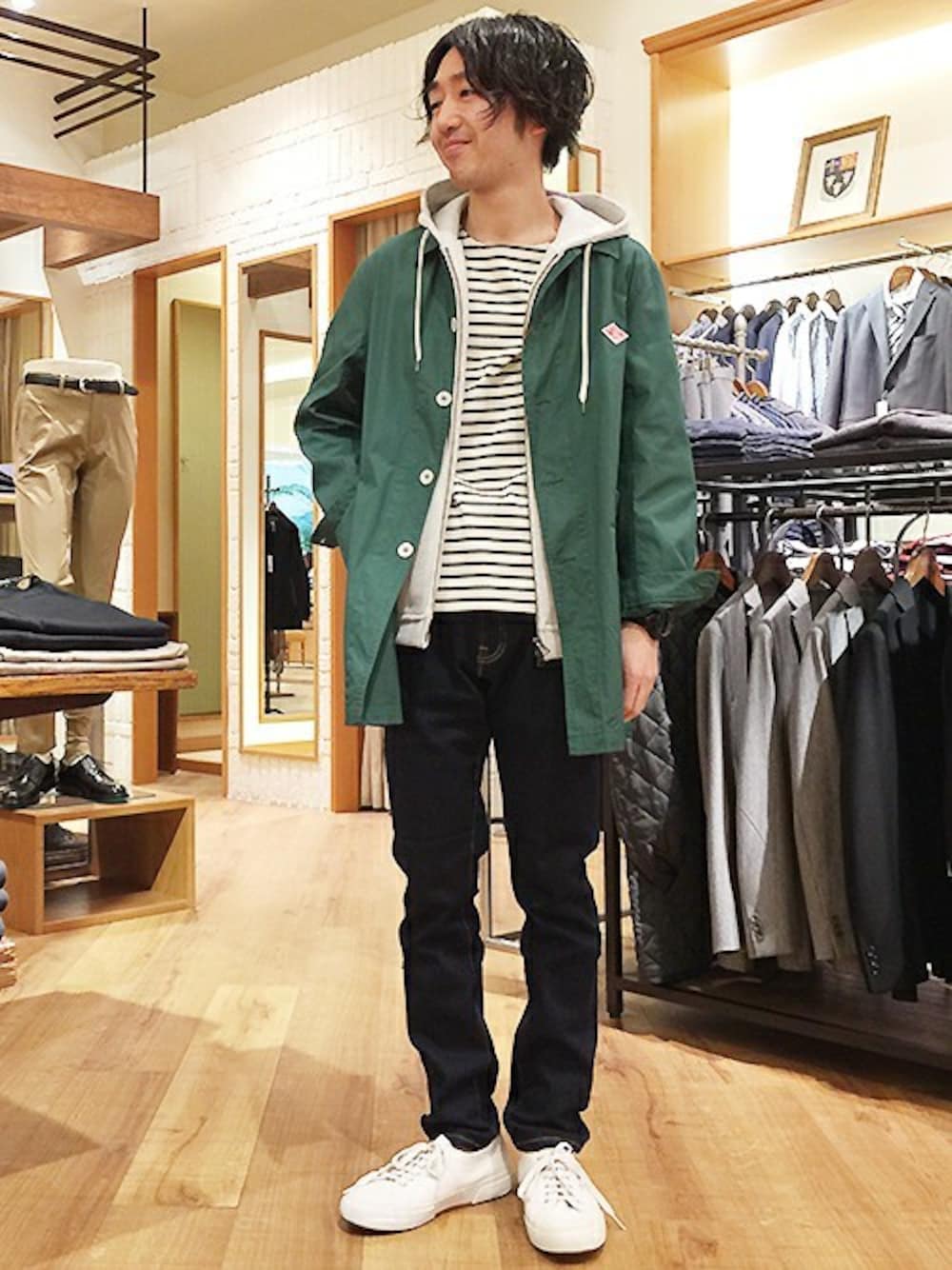 明るいカラーのコートを羽織った春満載のコーデ。 ショップでも大人気の「DANTON」のステンカラーコートは軽さと春らしい色合いが気分。 パーカーと細身のパンツを組み合わせてCITY BOYなテイストに仕上げました。