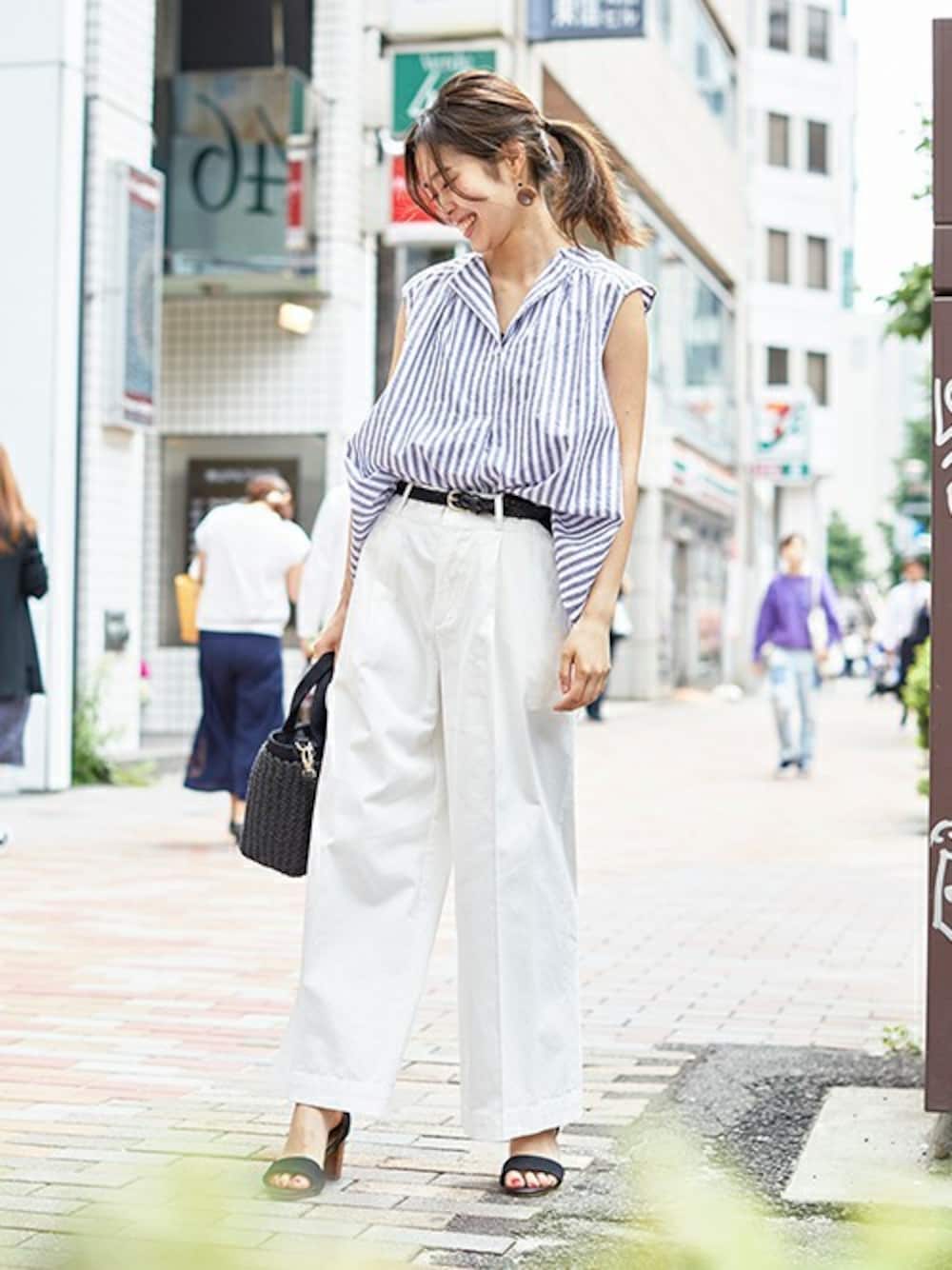 チノパンでつくる夏コーデ☆ 今シーズンはチノパンが気分です♪ ハイウエスト、ワイドシルエットと今年らしくカスタマイズされたこのパンツは きれいめにもスニーカーでカジュアルにも合わせられてとても気に入っています! ブルーのストライプのリネン混シャツと合わせてブルー×ホワイトの爽やかコーデにしてみました。 白いパンツも洗える素材なら気軽に着られてうれしいですね♪ ◆綿麻スキッパーAラインノースリーブブラウス(FH721032/ブルーストライプ/サイズ36)