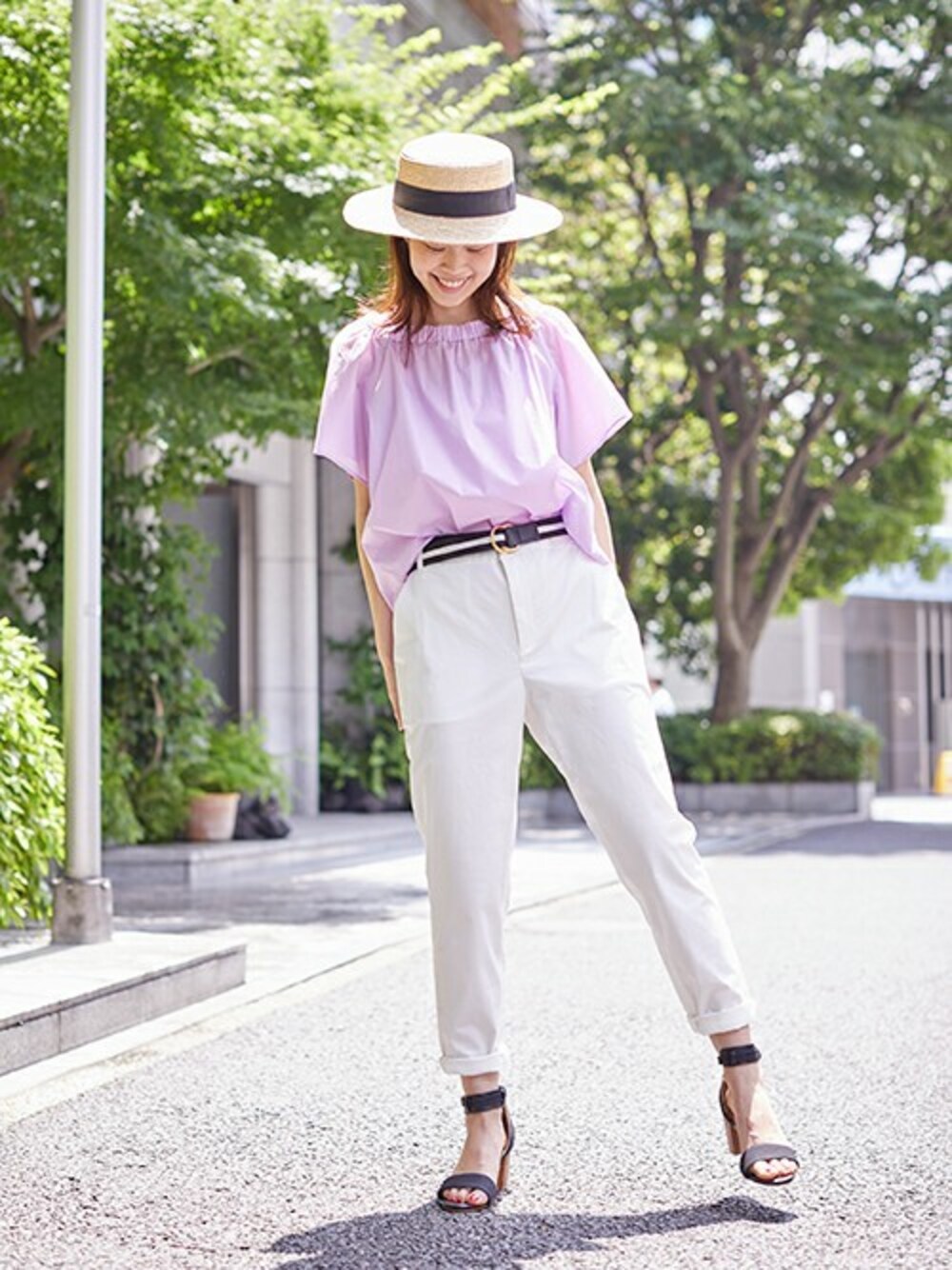トラッドなハットとベルトをポイントにしたパンツコーデです♪ 可愛いラベンダーカラーのトップスにホワイトチノパンを合わせて夏らしい配色に。 フェミニンとメンズライクをMIXさせるとカジュアルも大人っぽくなっておすすめです!