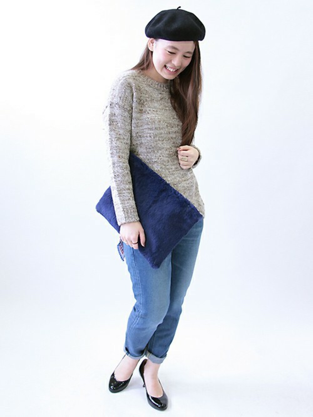 ミックスカラーがオシャレなイタリー糸を使用したニットが主役! 一見シンプルな組み合わせですが、ニットの奥行きのある色使いでしっかりオシャレ感が出せますよ。 やや長めの着丈ですが、小柄な私でもバランスは取りやすいです! この時期らしいファーアイテムでアクセントを付けてみました。