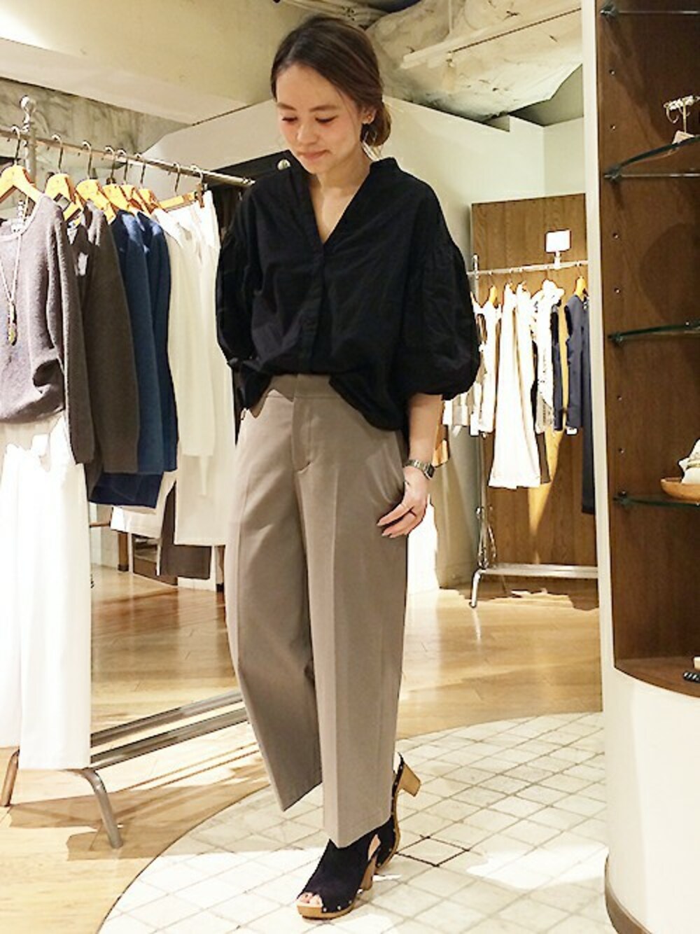 トレンドのボリュームスリーブのブラウス、可愛らしくなってしまいがちなアイテムですが、 今回はちょっとモードな雰囲気にアレンジしました! アースカラーのワイドパンツと合わせてシンプルに。ブラウスはワンサイズですが、ゆったりとしているので 裾をインして重くなり過ぎない様にしました。 ゴツめのサンダルもカッコ良く仕上げるポイントですよ〜☆