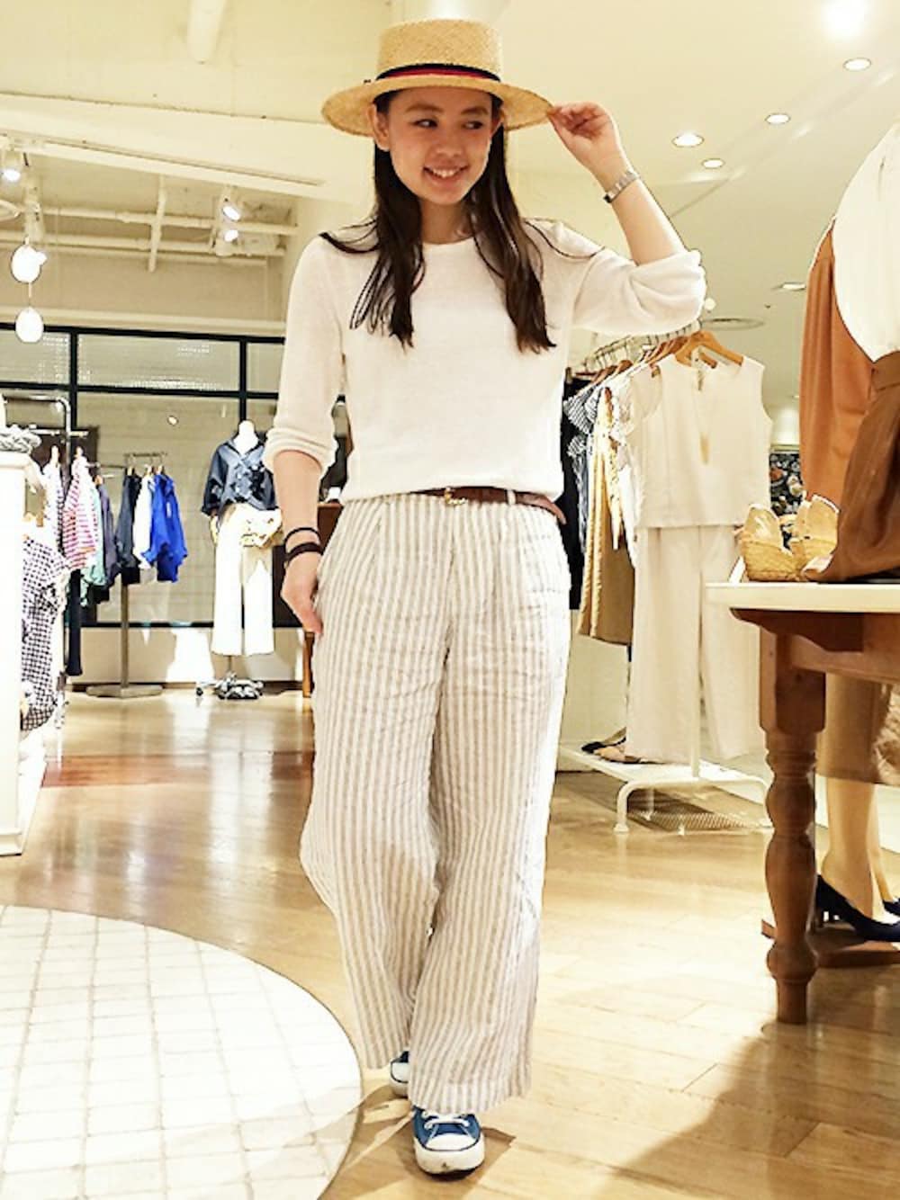 先行予約でも人気だったワイドパンツがいよいよ入荷しましたよ〜! ワッシャー感と落ち着いた色のストライプで、夏コーデの主役にピッタリ。 トップスとトーンや素材感を合わせてスッキリ大人な表情に。 シンプルコーデの仕上げは、存在感のあるハットでキュートに味付け☆ ■ハット(60518138201 )ベージュ/FREE