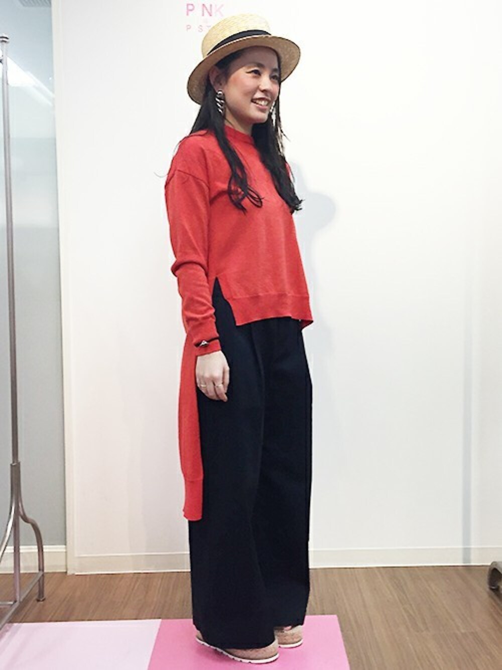 前後の着丈差が特徴的なニットは一枚で存在感たっぷり。 一見シンプルに見える着こなしをぐっと華やかに見せてくれる、スタッフにも人気のアイテムです。 デザインもさることながら、イタリー糸を使用したソフトな肌触りも見逃せませんよ! カンカン帽やサンダルでどこかレトロなリゾートテイストをプラスしました。