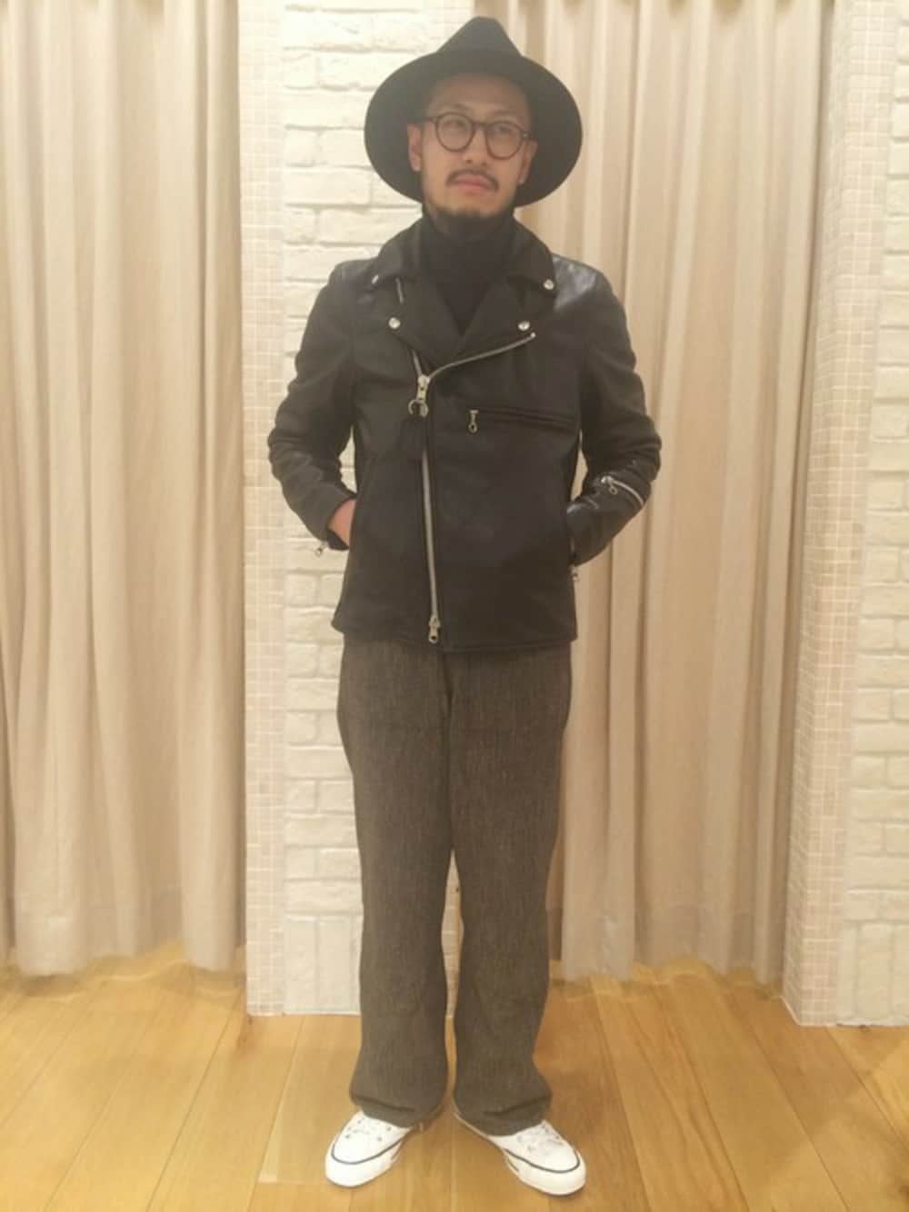 タイトなレザージャケットを主役にシンプルにまとめました。 ハードなイメージが強くなるアイテムなので、あえて足元を軽めのコンバースにしたのがポイント。 程よく抜け感が出せるので気に入っています。