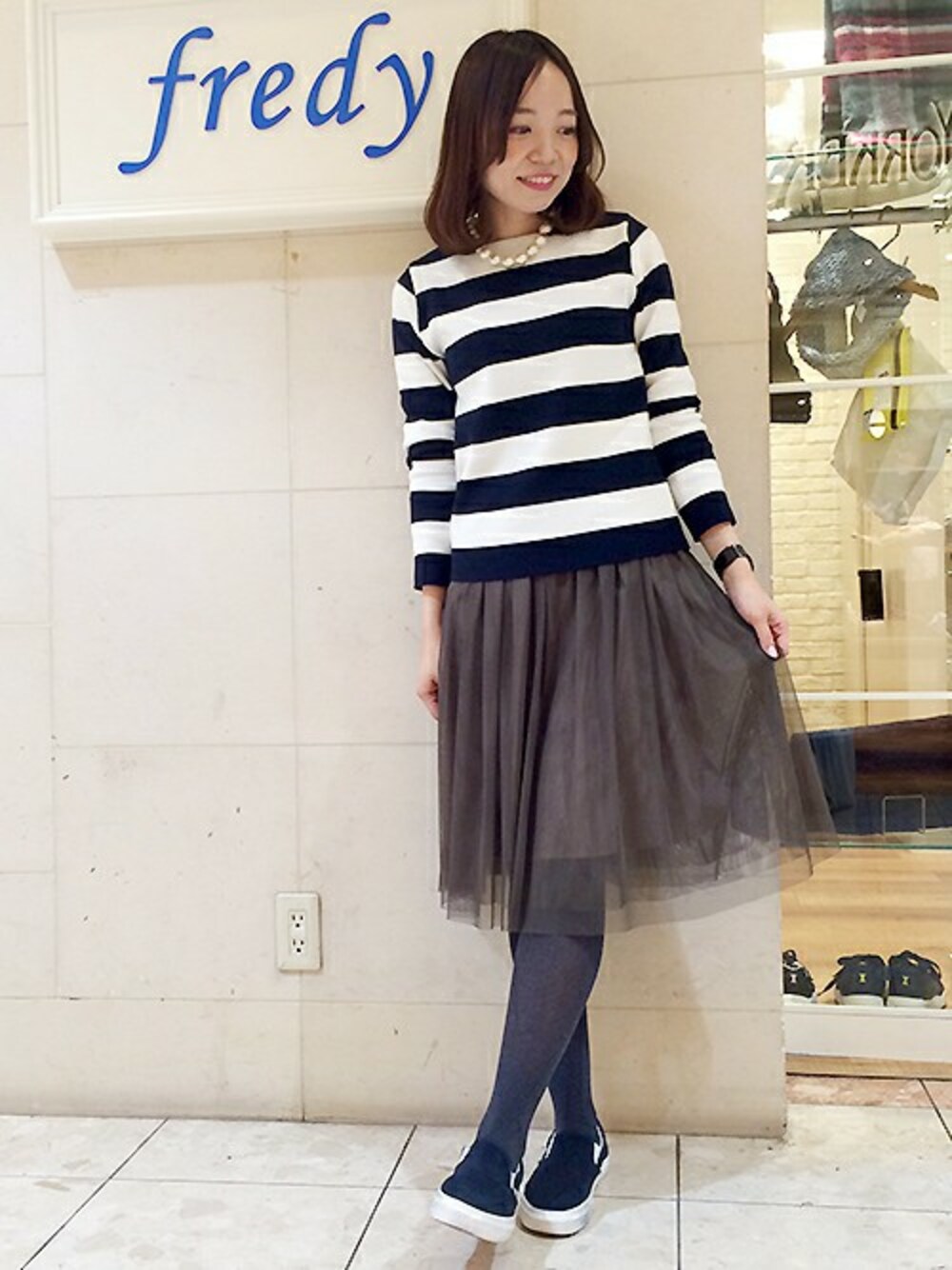 定番のボーダーニットもミラノリブのしっかりした生地感でパリッと大人な印象。 柔らかいチュールスカートと合わせたベーシックな組み合わせはやっぱり外せません! 暖かくなったらサンダルやフラットシューズで合わせるのも楽しみですね!