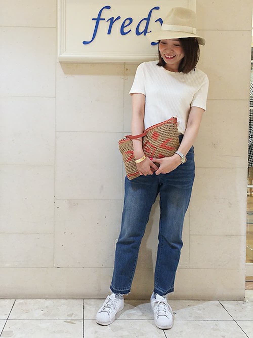 今年注目のリブTシャツをボーイッシュにアレンジ。 同じ素材でタイトスカートやワンピースもご用意していますが、今回はあえてカットオフデニムと やんちゃな雰囲気に仕上げました♪ シーズンを通して色々な着こなしが楽しめるおすすめアイテムです! ■デニム(60351229001)ブルー/36