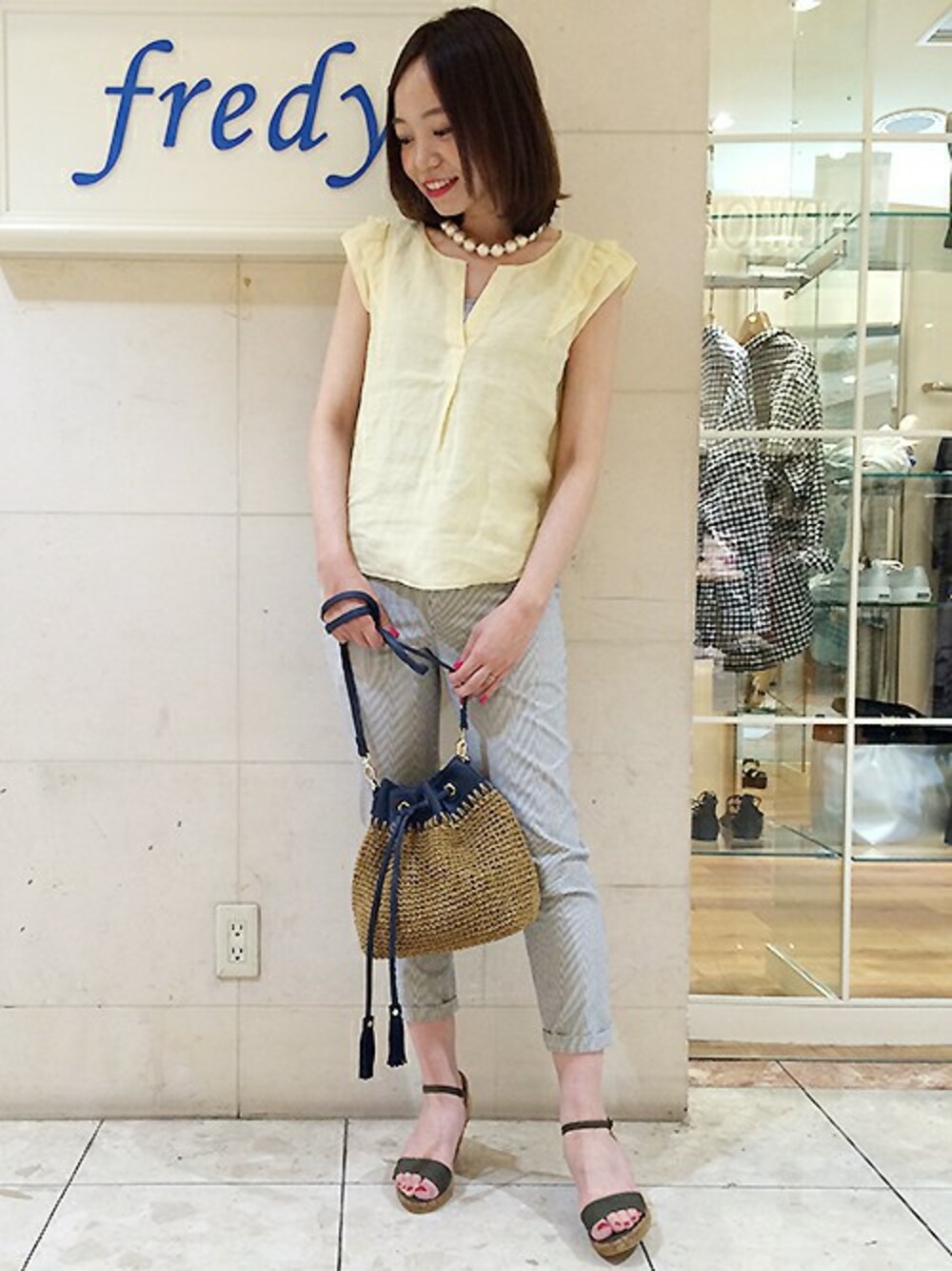 爽やかなリネンのブラウスは袖のフリルがポイント! ベーシックな組み合わせもイエローの優しい色合いで華やかな雰囲気になりますよ。 サンダルや編み込みのバッグで初夏のオシャレが楽しみになる一枚です。