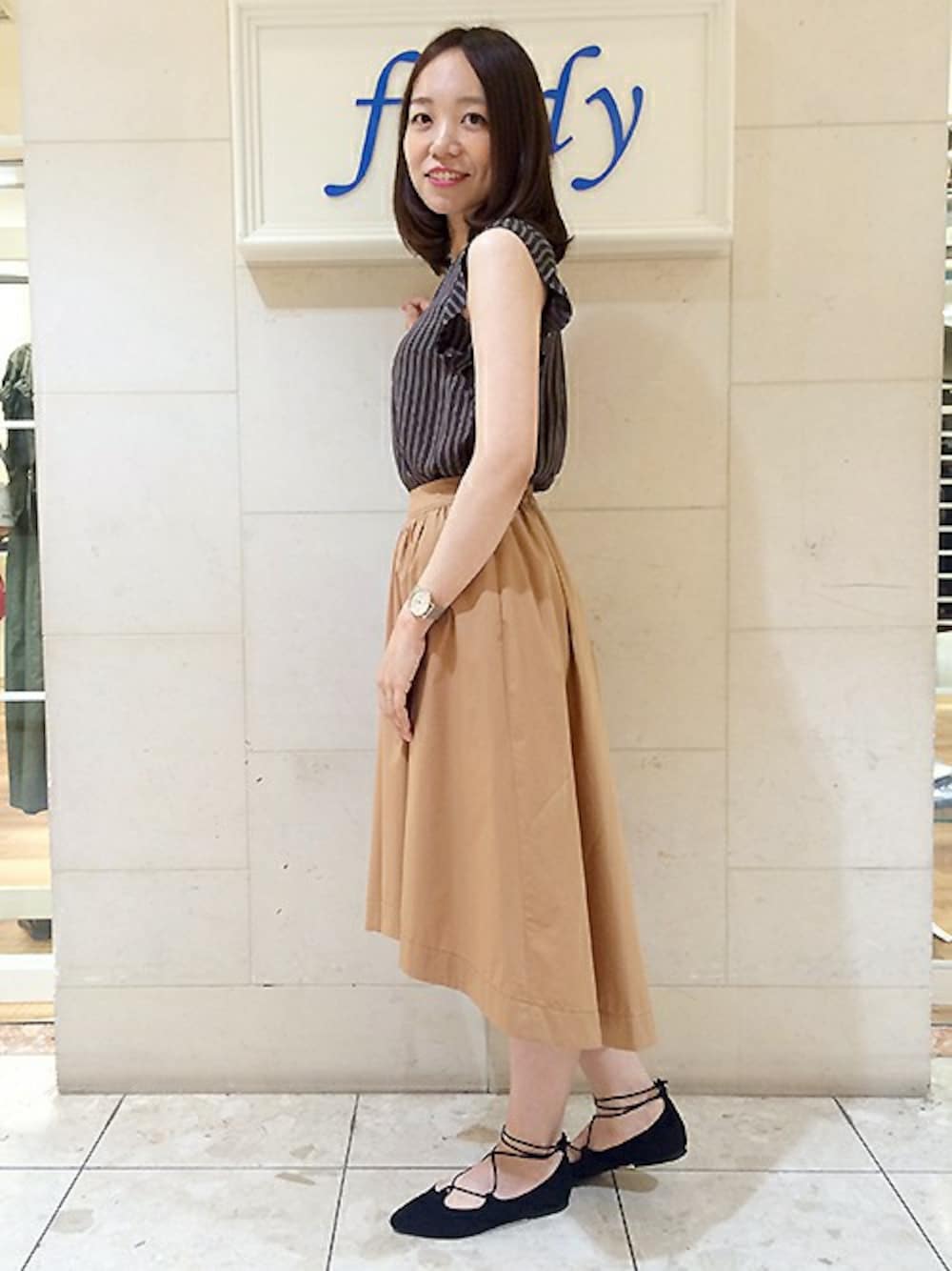 アシンメトリーなデザインのスカートを主役に秋色を取り入れたコーデに挑戦しました。 さらっとした質感のブラウスは今の時期から秋までしっかり着られる一枚。 深みのあるブラウンをチョイスして少しだけ季節先取り感を出しました。 足元は人気のレーズアップシューズを合わせて今年らしさをプラス、フラットなので とっても履き心地が良いのも魅力です!