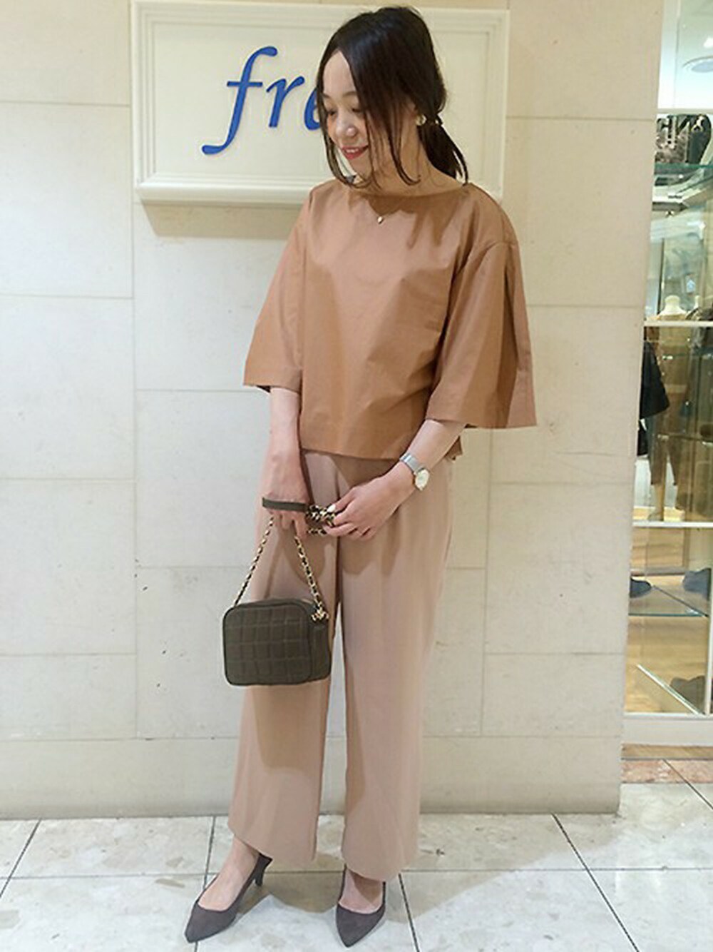 広がった袖が特徴のシンプルブラウス、秋らしい色合いがお気に入りです。 少しだけトーンを変えたワイドパンツとの組み合わせもおすすめです。 シンプルなアイテム同士だからこそハリのある質感やフォルムにこだわりたいですね。 ◆シューズ(60512537101)ブラウン/Lサイズ