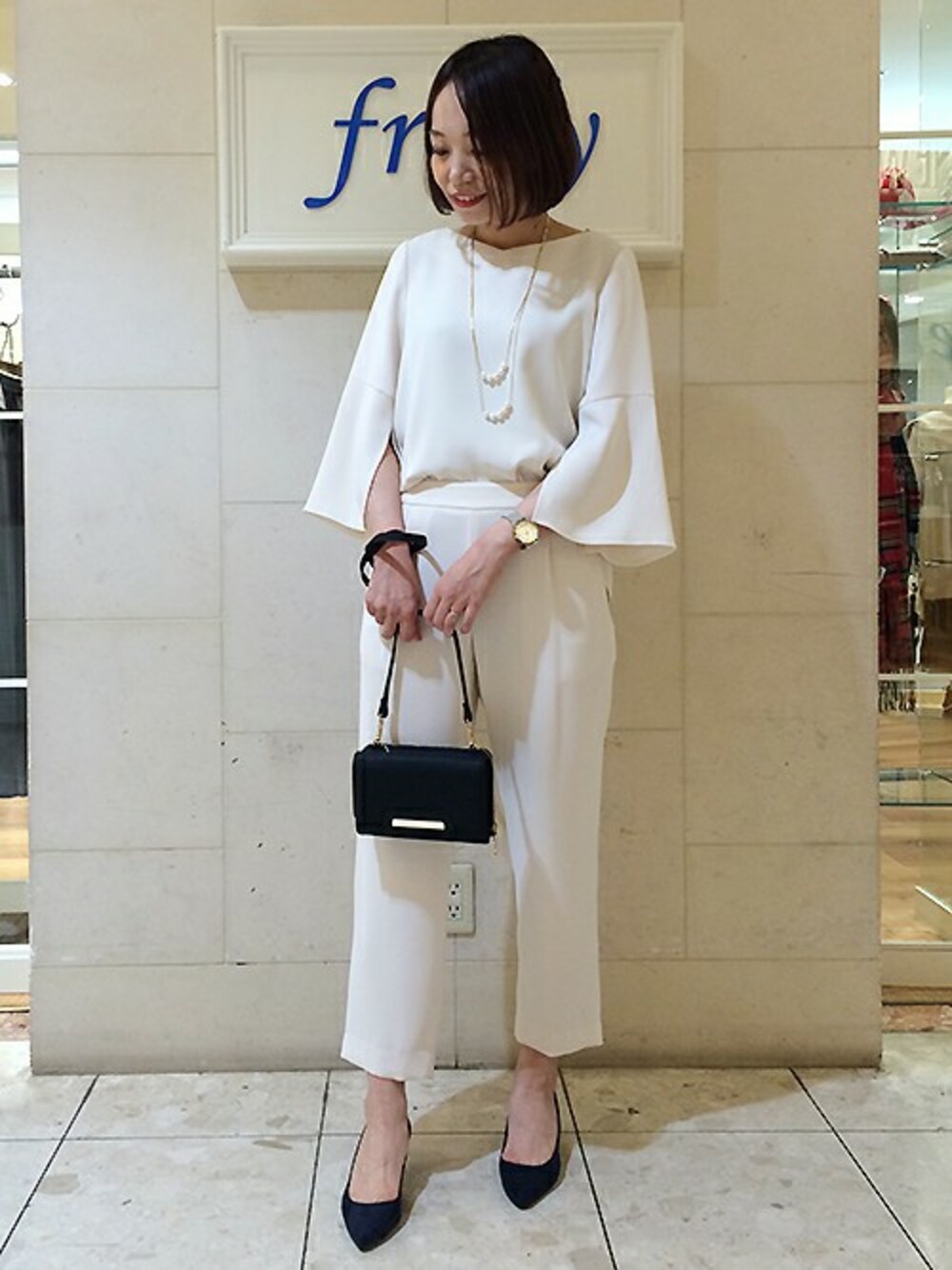 上品な質感のセットアップ、思い切ってオールホワイトでまとめてみました! ちらりと手首が覗くスリット入りのブラウスはシンプルな組み合わせの良いアクセントに。 小物をブラックでまとめると全体がシャープな印象にまとまります。