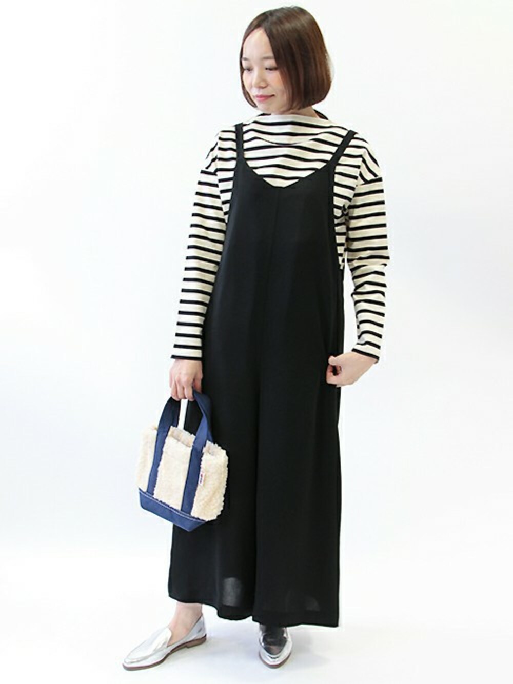 ボーダートップスとオールインワンのゆるっと休日コーデ。 襟元に特徴のあるトップスは腕周りに余裕があって着心地が良いですよ! メインの一枚として、インナーとしてシーズンを通して活躍してくれそう。 もちろんオールインワンもこれからニットと合わせる楽しみも♥︎ もこもこバッグで更に季節感をプラスしました。