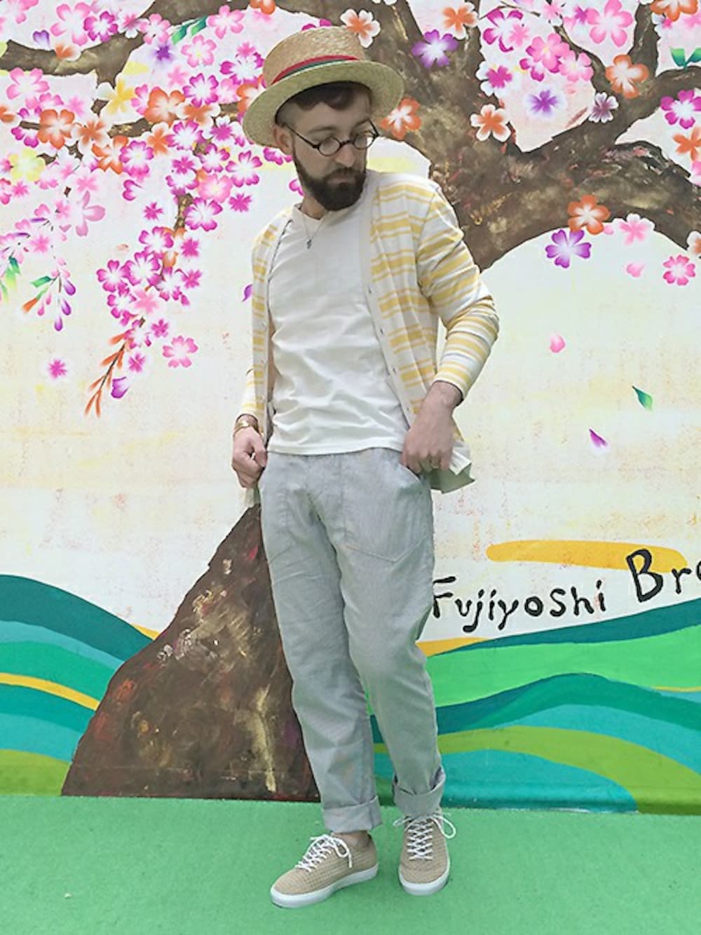 ナチュラルな色使いにこだわった春のピクニックスタイル。 ペールトーンでまとめた中に、春の日差しに映えるイエローのボーダーが全体のイメージを引き立てています。 ピクニックにぴったりのイージーパンツやスニーカーで楽しむ準備もOKです! もちろん麦わらのハットで個性をプラスするのも忘れずに。。。☆
