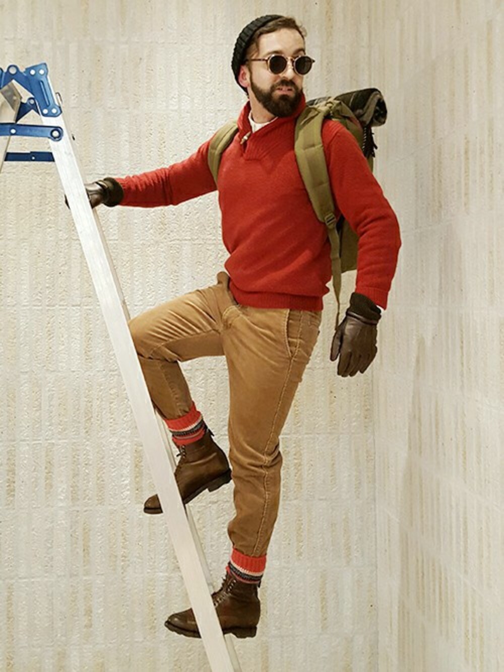 アウトドアスタイルですよ。 ・・・お店の中で出来るアウトドア、何でも気分だと思います! いよいよ初雪の降る時期、冬休みは山で遊びたいですね! スキーはもちろん散歩のためにに動きやすい服をチョイスしました。 赤ニットとベージュのコーデュロイパンツのカラーリング、この時期らしい組み合わせでオシャレですよね。 合わせたレザーグローブは防寒しつつタッチパネルに対応しており機能的! しっかり外での活動も楽しめますよ。 冬休みまでお店をお掃除しながら脚立で練習します(笑) ■バッグ(50769662351)カーキ/FREE ■サングラス(VM565153)ブラウン系/FREE ■ニット帽(50726568351)ブラック/FREE