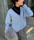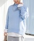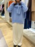 カーディガンを肩に巻いてワントーンで合わせてみました・ カラー展開も豊富でどのカラーも色が綺麗なニットになっています^^ 今回着用しているブルーの色味は柔らかく普段 色物を着ない方でも着やすくおすすめです! サイズ感も程よいゆったり感で着やすさも◎