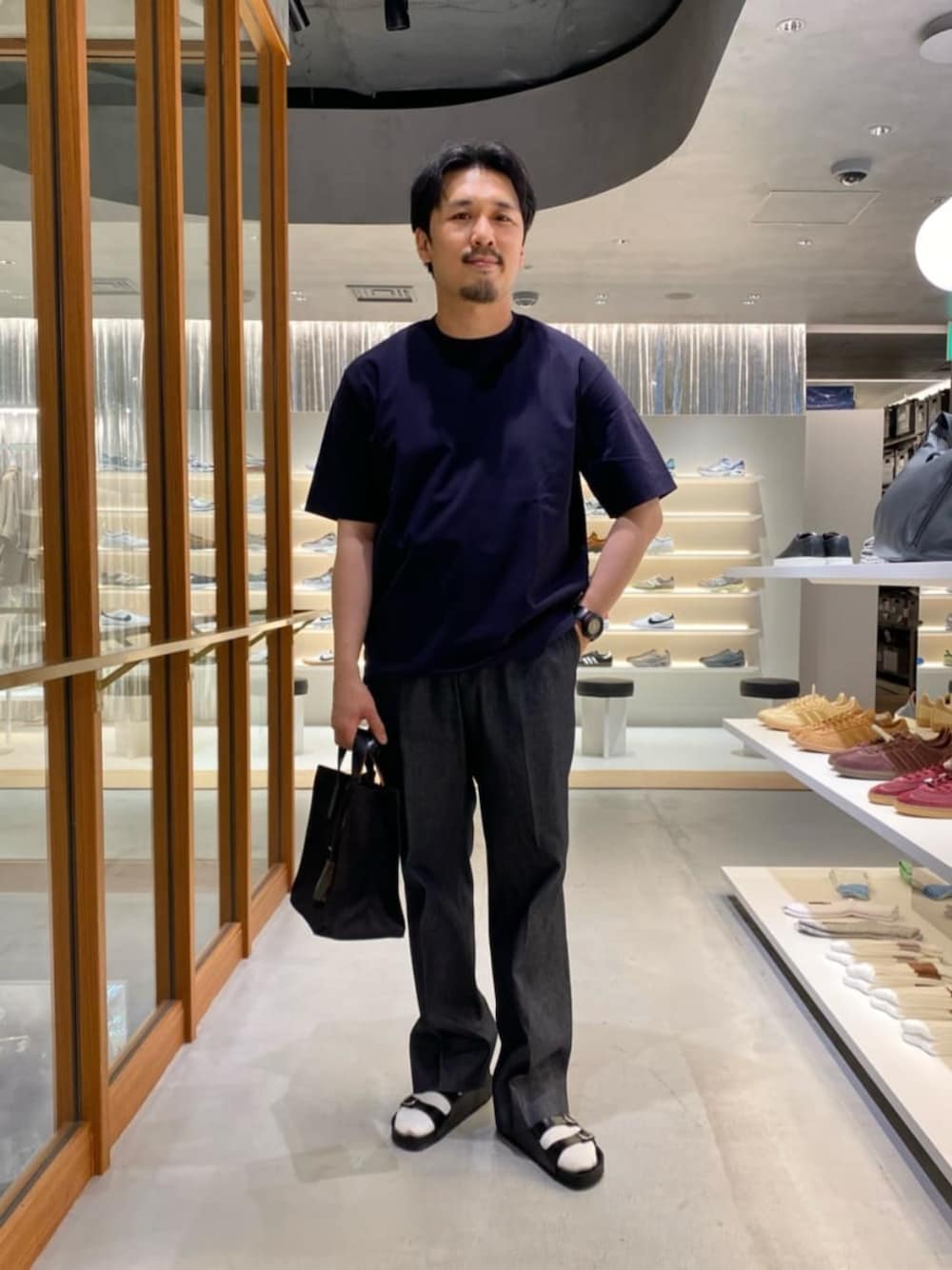 ●身長 175cm ●普段サイズ トップス:L(50) ボトムス:L(50) シューズ:革靴:26.0cm スニーカー:27.5cm 【サイズ感】 トップス/ゆったりめのボックスシルエット ボトムス/標準 サンダル/標準(幅やや細め) 【コーディネートポイント】 ボディラインを拾いにくいボックスシルエットとネイビーカラーが一枚着でも見映えしてくれるUA定番ポンチTシャツコーディネート。ポイントはパンツは同系色でまとめつつ、異素材合わせでメリハリをつけています。