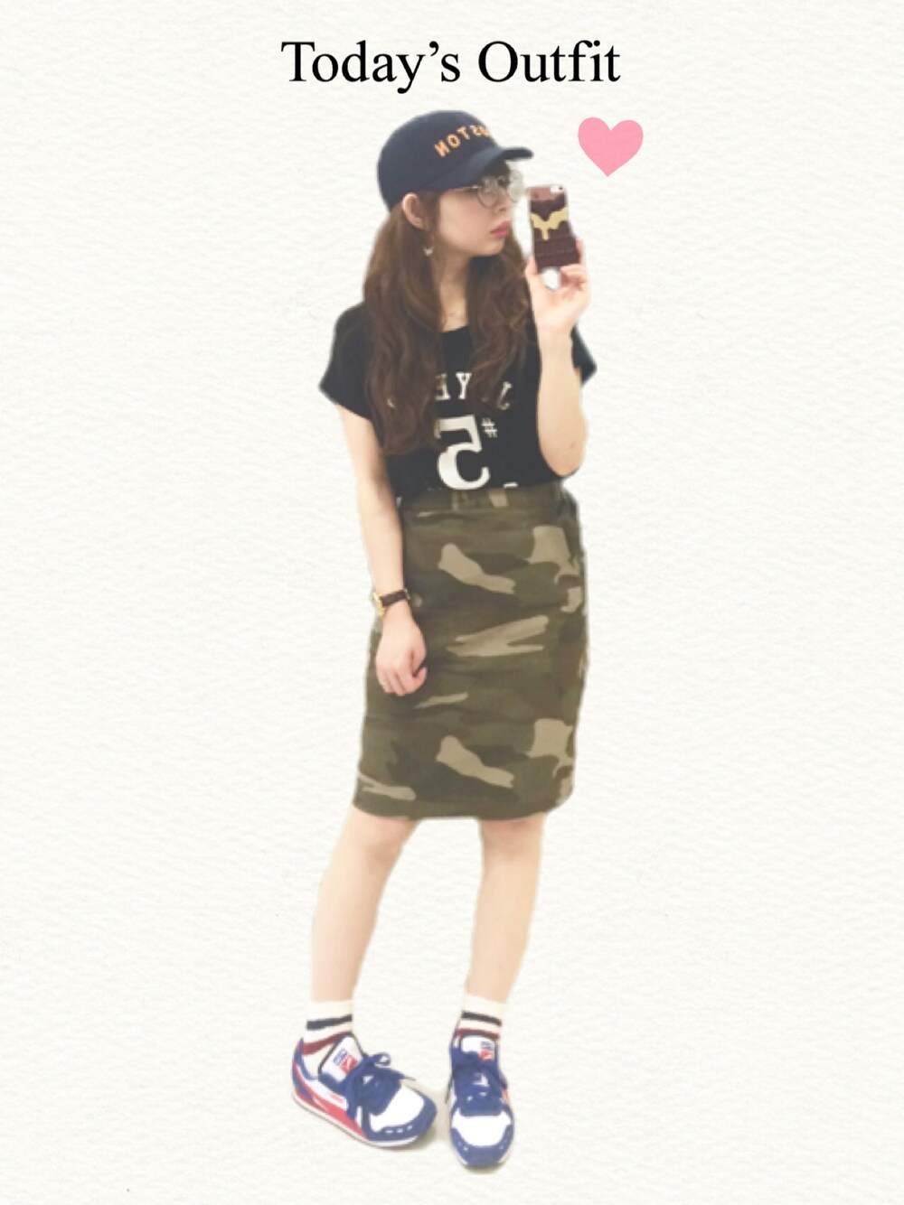 今日は久しぶりにカモフラスカート履きました(o^^o)♬ キャップとスニーカー、ラインソックスでスポーティーな感じです♬ 最近こうゆうコーデしてなかった気がするので、1日楽しくお仕事できました(*^^*)