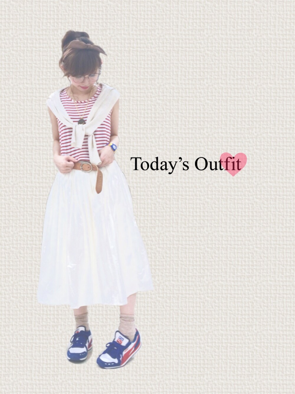 こんばんは♬ 昨日の反動で、今日は久しぶりにガーリーにしてみました(o^^o) 赤ボーダーのタンクに白のボリュームスカート。 ベージュカーデ肩がけ。 ポニーテールにリボンのカチューシャ。 丸めがね。 ただ、やたら甘くなりそうだったので、PUMAのスニーカーとLEGOの腕時計で少しハズしました〜😅