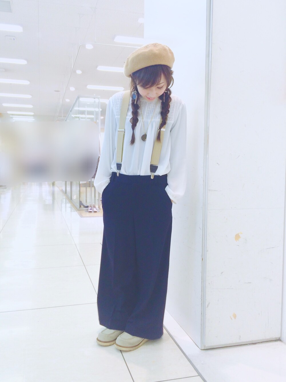 おはようございます♬😊 先日のお仕事スタイルです〜☺️ クラシカルな雰囲気の立ち襟レースブラウスにネイビーのワイドパンツを合わせて、太めのサスペンダー。 ベレー帽、ブーツ、サスペンダーはベージュで統一。 通勤時は寒いので厚手のニットカーデを羽織りました〜😊 つい最近も似たような色合わせ着てましたね😂 ネイビー×白にベージュ、好きな色合わせなので偏りがちです😅