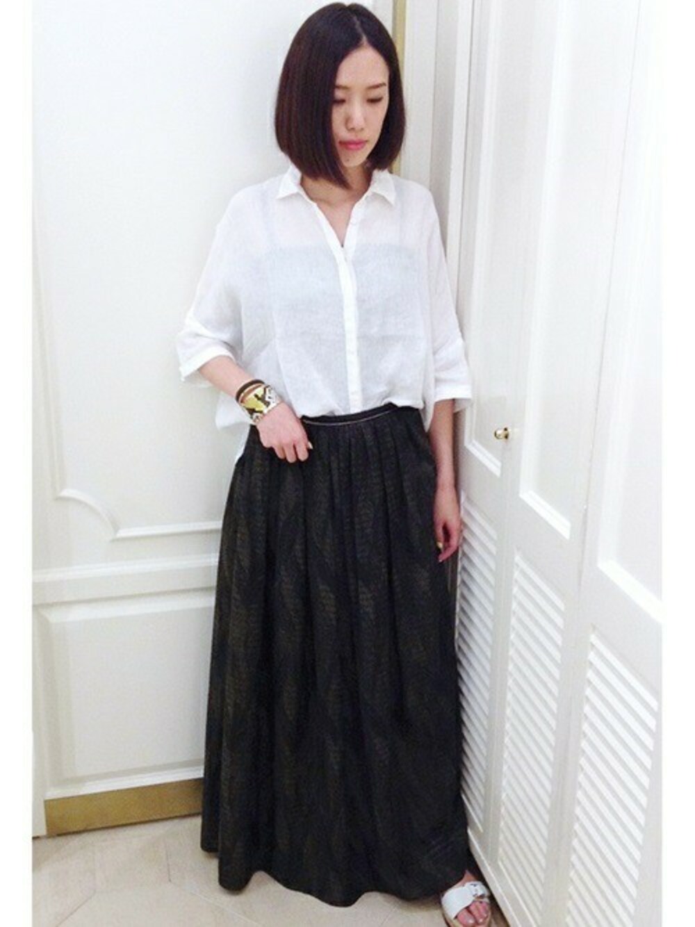 スタッフ4のスカート「◆シルクコットンボーダー葉柄プリント ロングスカート」を使ったコーディネート