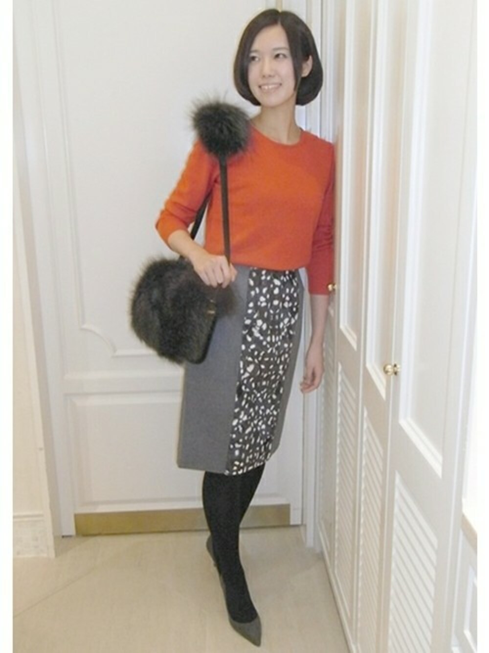 発色の良いカシミヤ100%ニットにインパクトのあるアニマルプリントスカートを合わせました。タイトなシルエットがポイントです。