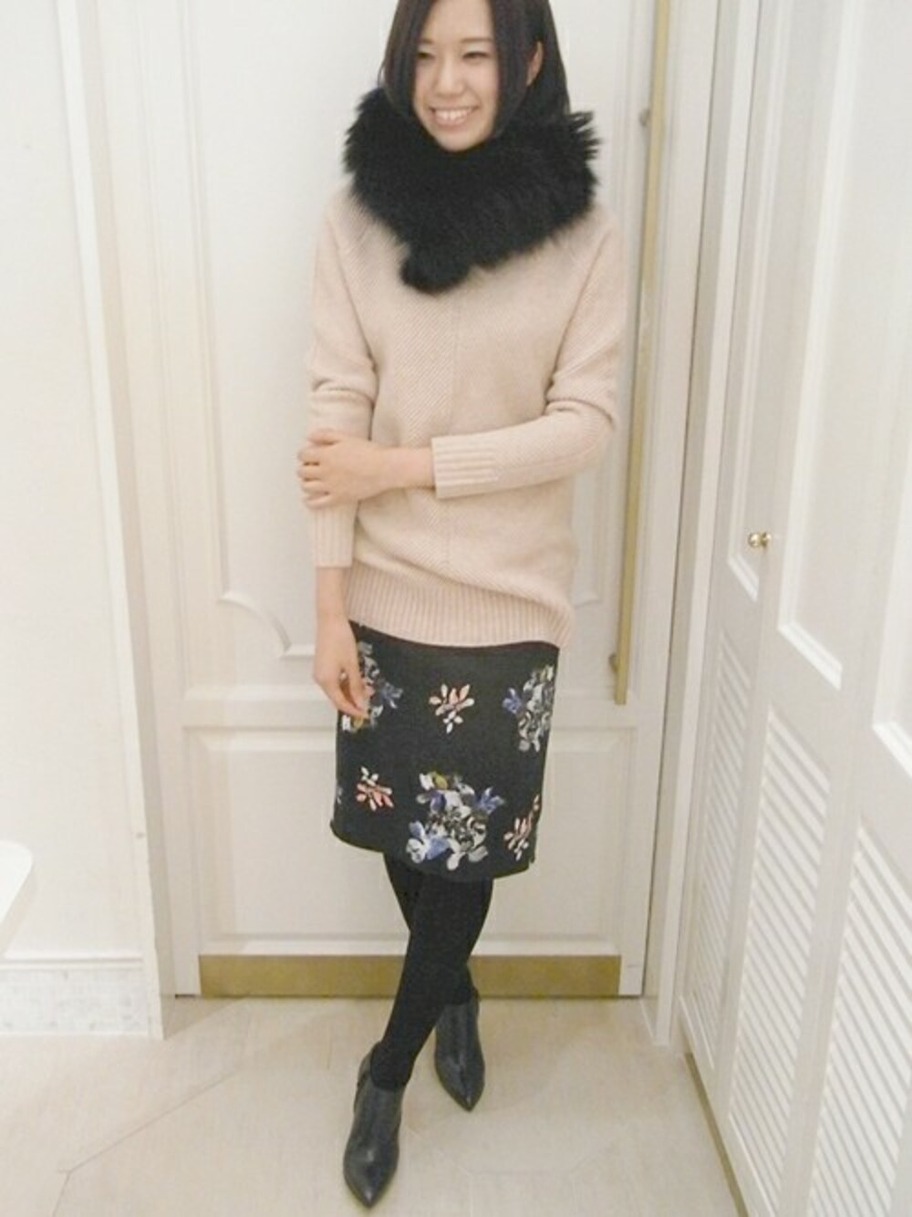 ざっくりとした編地がかわいいオフタートルニットにリアルファーのストールをプラス。ダークトーンの花柄スカートでシックに着こなしました。