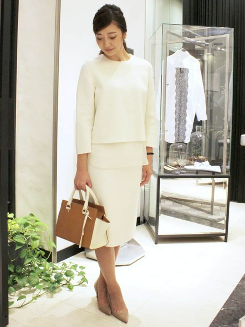 ダブルフェイス生地を使用したブラウスとスカートはセットアップでコーディネート。 上品な印象で、お食事や同窓会などちょっとしたオフィシャルシーンにお勧めです。