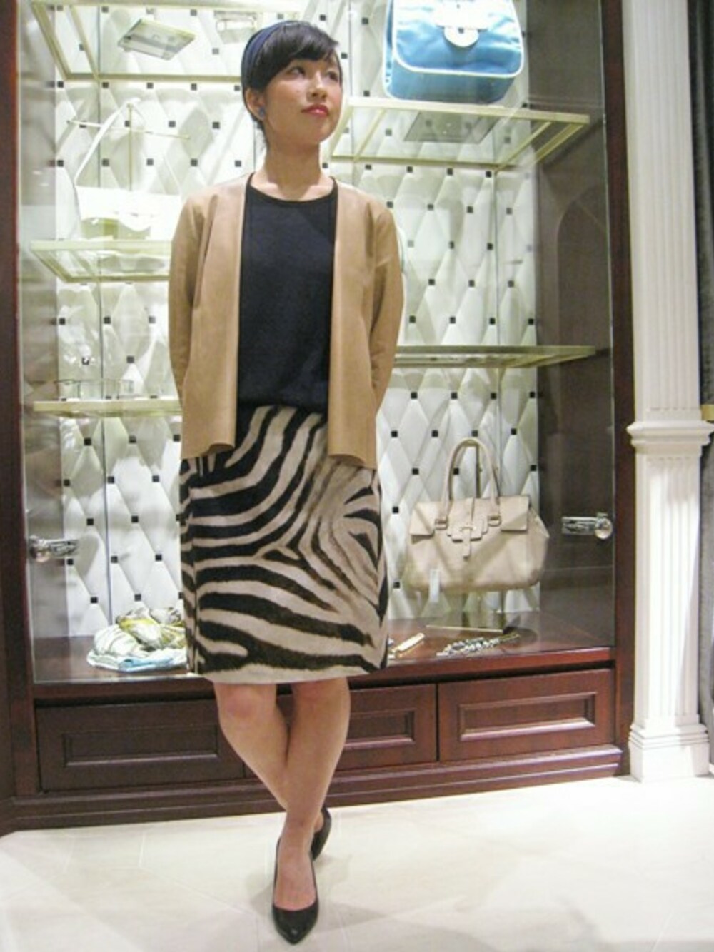 レザーのカーディガンを着ているような軽さが魅力のブルゾン。今季イチオシのゼブラと合わせて。