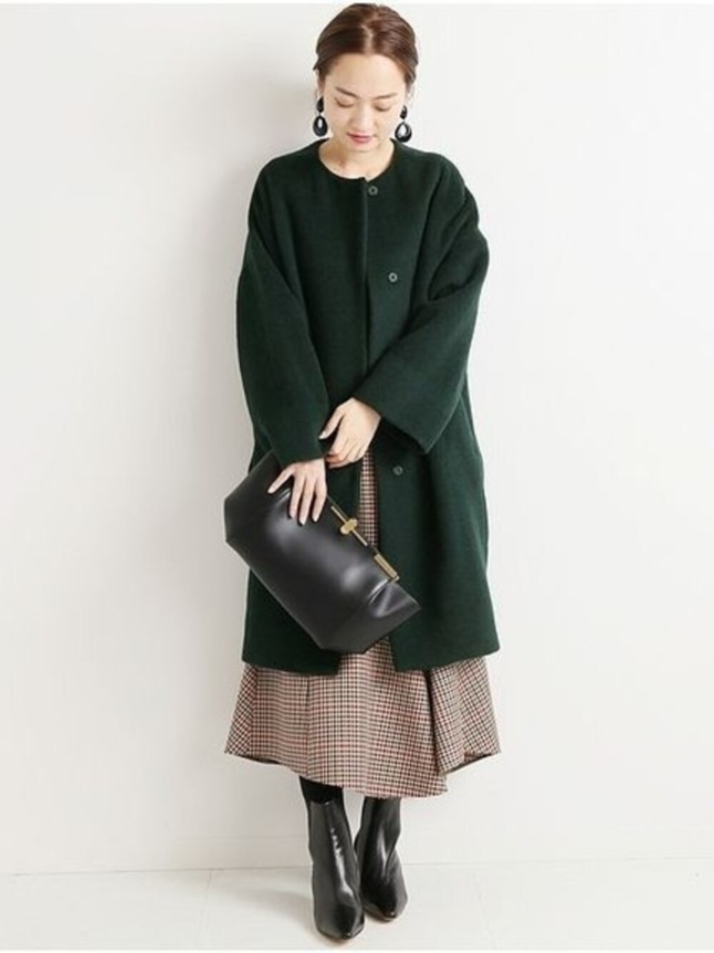 シンプルなデザインのクルーネックコート。 少し丸みのあるコクーンシルエットが、女性らしさを醸し出します。 チェック柄スカートで、シーズンムードを高めたコーディネートに。