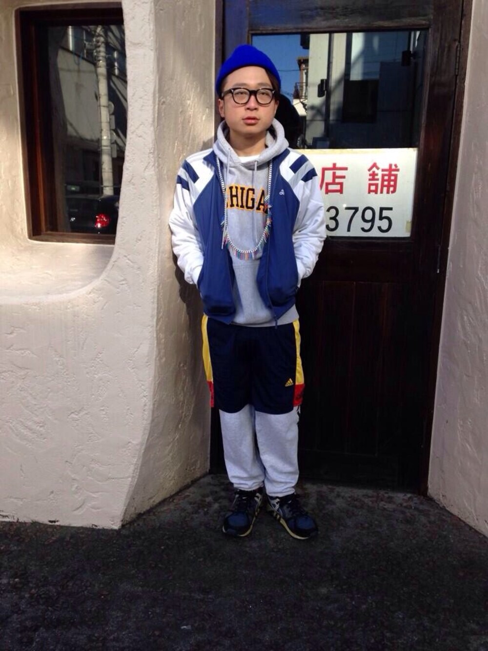 ブルー系のジャージを着用したメンズの冬コーディネートの1枚目の写真