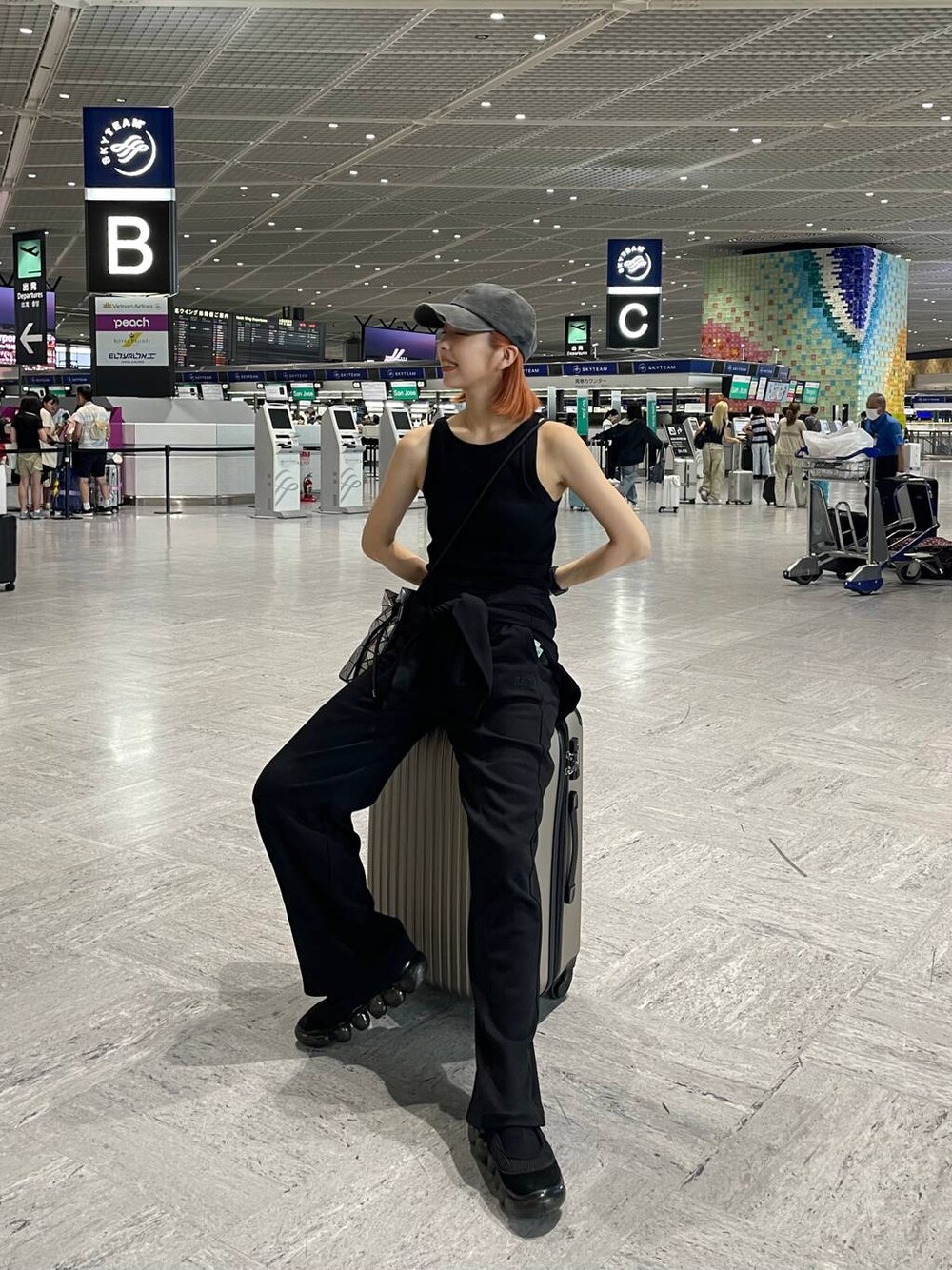旅行の移動日楽ちんコーデ🛫 カップ付きなので暑かったら1枚で肌寒いときはシャツ等のインナーとして大活躍な1着です✨ 164cm / 骨格ウェーブ ブルベ夏・イエベ春 👩🏻🦰Instagram 🍊TikTok