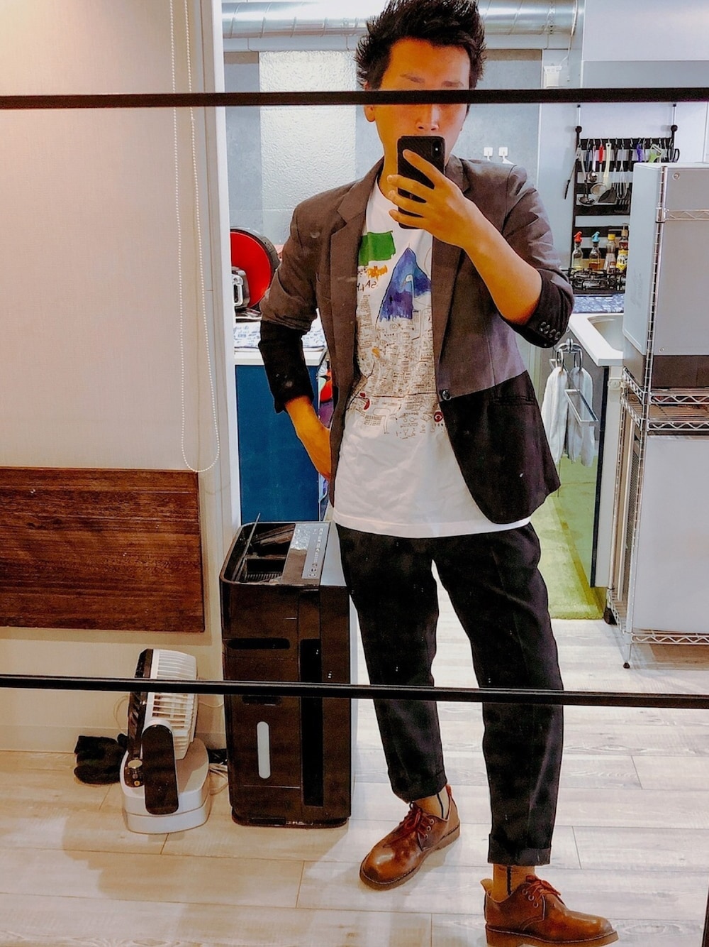 久々にユニクロでお手軽なやつ ユニクロUのワイドフィットテーパードパンツのBlack SサイズとバスキアのUTと ジャケットは数年前に買ったものを着て革靴は貰い物でブランド分からずです。 ソックスはCHICSTOCKSの文房具のロルバーンで有名なデルフォニックスとのコラボモデル。